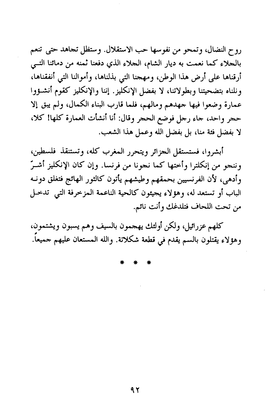 أبشروا، فستستقل الجزائر ويتحرر المغرب كله، وتستنقذ فلسطين، وننجو من إنكلترا وأختها كما نجونا من فرنسا. وإن كان الإنكليز أشرّ وأدهى، لأن الفرنسيين بحمقهم وطيشهم يأتون كالثور الهائج فتغلق دونه الباب أو تستعد له، وهؤلاء يجيئون كالحية الناعمة المزخرفة التي تدخل من تحت اللحاف فتلدغك وأنت نائم.