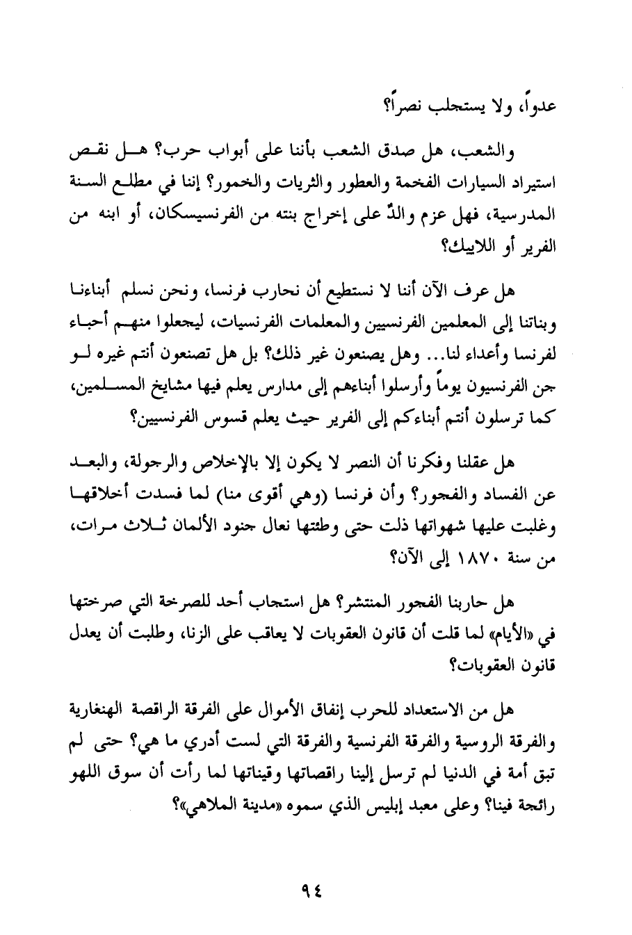 هل عقلنا وفكرنا أن النصر لا يكون إلا بالإخلاص والرجولة، والبعد عن الفساد والفجور؟ وأن فرنسا (وهي أقوى منا) لما فسدت أخلاقها وغلبت عليها شهواتها ذلت حتى وطئتها نعال جنود الألمان ثلاث مرات، من سنة 1875 إلى الآن؟