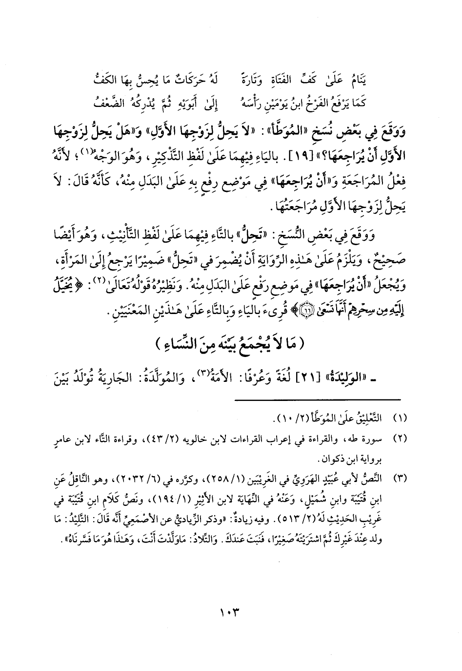 ووقع في بعض نسخ "الموطأ": "لا يحل لزوجها الأول" و"هل يحل لزوجها الأول أن يراجعها؟ " [19]. بالياء فيهما على لفظ التذكير، وهو الوجه؛ لأنه فعل المراجعة و"أن يراجعها" في موضع رفع به على البدل منه، كأنه قال: لا يحل لزوجها الأول مراجعتها.