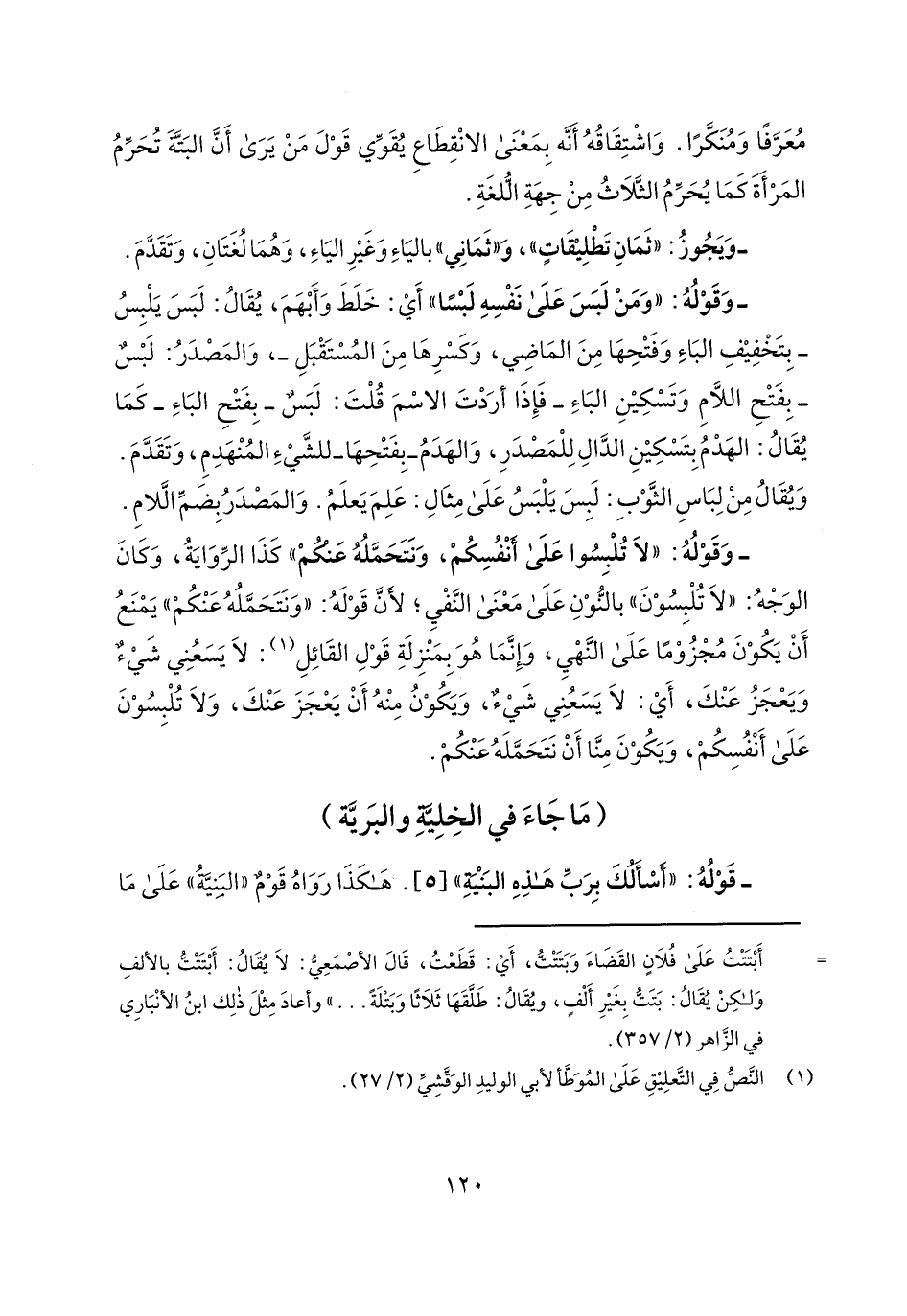 معرفاً ومنكراً. واشتقاقه أنه بمعنى الانقطاع يقوي قول من يرى أن البتة تحرم المرأة كما يحرم الثلاث من جهة اللغة.
