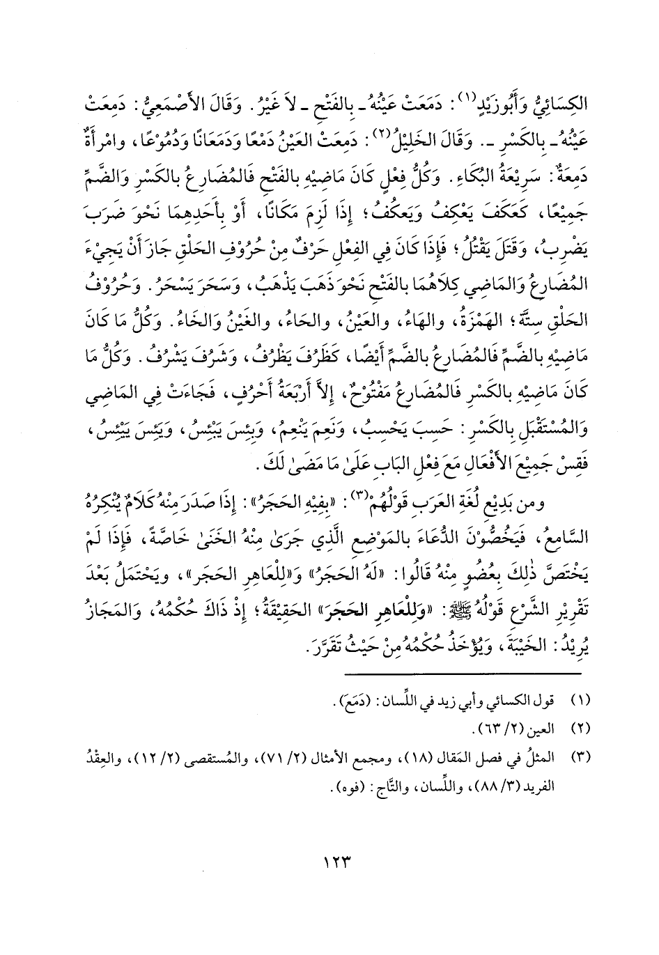 الكسائي وأبو زيد: دمعت عينه- بالفتح- لا غير. وقال الأصمعي: دمعت عينه- بالكسر-. وقال الخليل: دمعت العين دمعاً ودمعاناً ودموعاً، وامرأة دمعة: سريعة البكاء. وكل فعل كان ماضيه بالفتح فالمضارع بالكسر والضم جميعاً، كعكف يعكف ويعكف؛ إذا لزم مكاناً، أو بأحدهما نحو ضرب يضرب، وقتل يقتل؛ فإذا كان في الفعل حرف من حروف الحلق جاز أن يجيء المضارع والماضي كلاهما بالفتح نحو ذهب يذهب، وسحر يسحر. وحروف الحلق ستة؛ الهمزة، والهاء، والعين، والحاء، والغين والخاء. وكل ما كان ماضيه بالضم فالمضارع بالضم أيضاً، كظرف يظرف، وشرف يشرف. وكل ما كان ماضيه بالكسر فالمضارع مفتوح، إلا أربعة أحرف، فجاءت في الماضي والمستقبل بالكسر: حسب يحسب، ونعم ينعم، وبئس يبئس، ويئس ييئس، فقس جميع الأفعال مع فعل الباب على ما مضى لك.