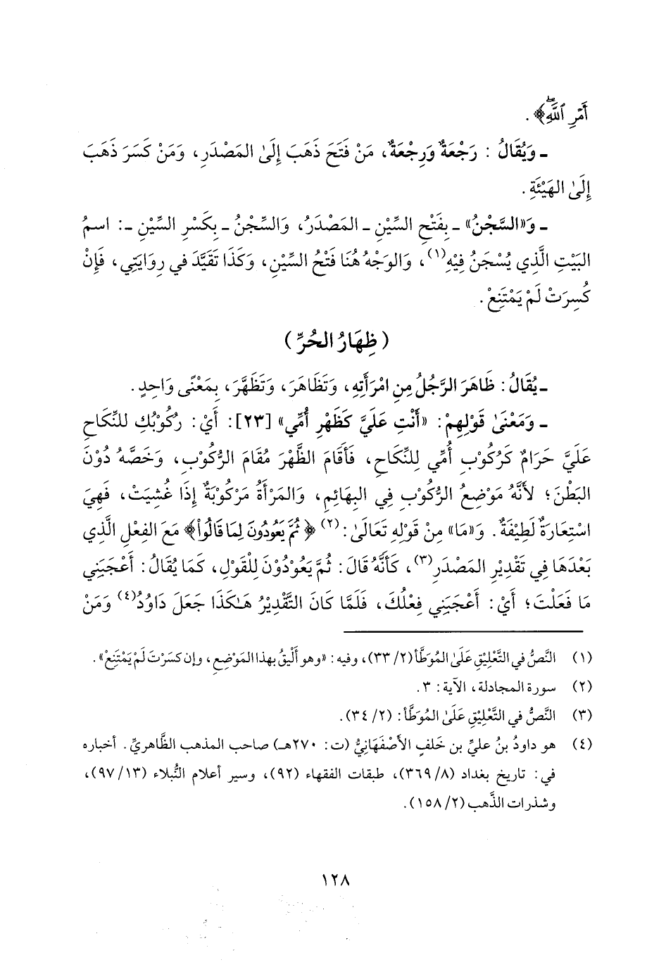 - ومعنى قولهم: "أنت علي كظهر أمي" [23]: أي: ركوبك للنكاح علي حرام كركوب أمي للنكاح، فأقام الظهر مقام الركوب، وخصه دون البطن؛ لأنه موضع الركوب في البهائم، والمرأة مركوبة إذا غشيت، فهي استعارة لطيفة. و"ما" من قوله تعالى: {ثُمَّ يَعُودُونَ لِمَا قَالُوا} مع الفعل الذي بعدها في تقدير المصدر، كأنه قال: ثم يعودون للقول، كما يقال: أعجبني ما فعلت؛ أي: أعجبني فعلك، فلما كان التقدير هكذا جعل داود ومن