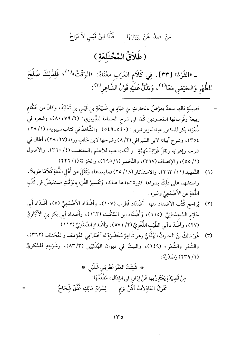 - "القرء" [33]. في كلام العرب معناه: "الوقت"؛ فلذلك صلح للطهر والحيض معاً، ويدل عليه قول الشاعر: