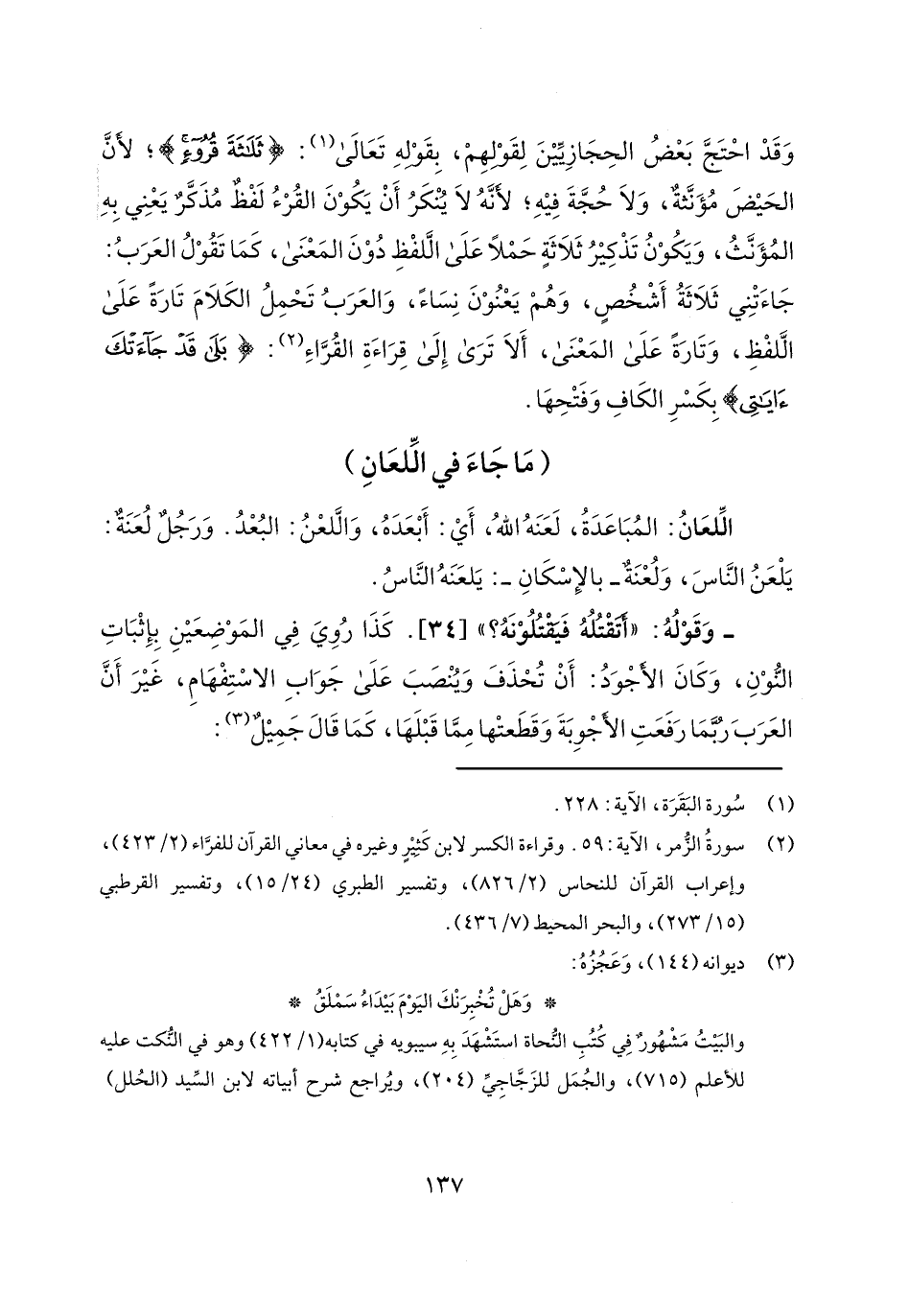 وقد احتج بعض الحجازيين لقولهم، بقوله تعالى: {ثَلاثَةَ قُرُوءٍ}؛ لأن الحيض مؤنثة، ولا حجة فيه؛ لأنه لا ينكر أن يكون القرء لفظ مذكر يعني به المؤنث، ويكون تذكير ثلاثة حملاً على اللفظ دون المعنى، كما تقول العرب: جاءتني ثلاثة أشخص، وهم يعنون نساء، والعرب تحمل الكلام تارة على اللفظ، وتارة على المعنى، ألا ترى إلى قراءة القراء: {بَلَى قَدْ جَاءَتْكَ آيَاتِي} بكسر الكاف وفتحها.