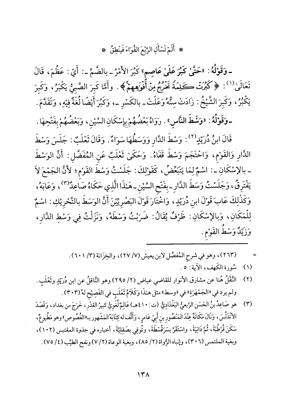 قال ابن دريد: وسط الدار ووسطها سواء. وقال ثعلب: جلس وسط الدار والقوم، واحتجم وسط قفاه. وحكى ثعلب عن المفضل: أن الوسط- بالإسكان-: اسم لما يتبعض، كقولك: جلست وسط القوم؛ لأن الجمع لا يفترق، وجلست وسط- بفتح السين- هذا الذي حكاه صاعد، وعابه، وكذلك عاب قول ابن دريد، واختار قول البصريين أن الوسط بالتحريك: اسم للمكان، وبالإسكان: ظرف يقال: ضربت وسطه، ونزلت في وسط الدار، وزيد وسط القوم.