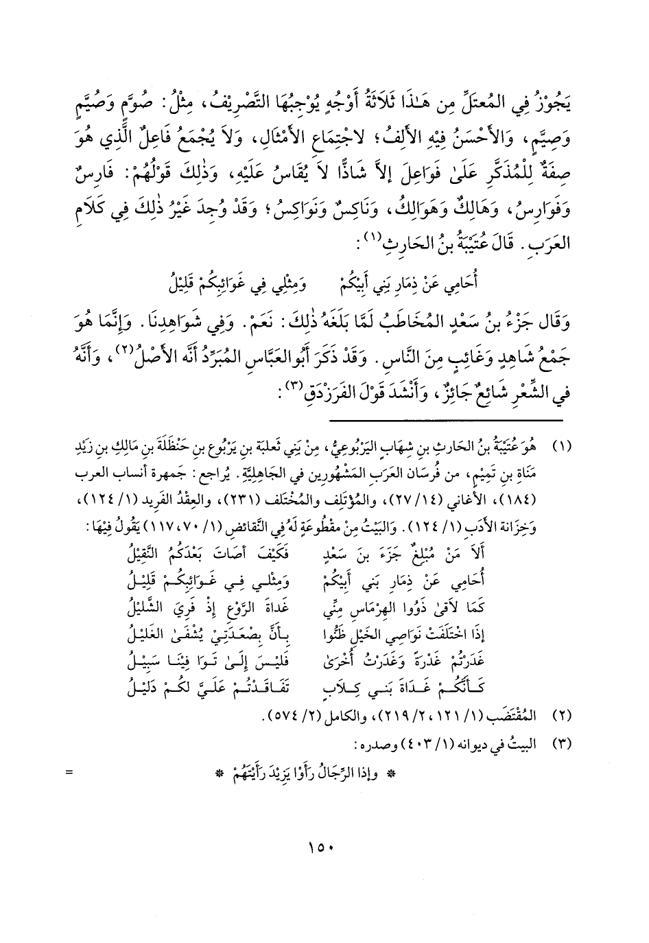 يجوز في المعتل من هذا ثلاثة أوجه يوجبها التصريف، مثل: صوم وصيم وصيم، والأحسن فيه الألف؛ لاجتماع الأمثال، ولا يجمع فاعل الذي هو صفة للمذكر على فواعل إلا شاذاً لا يقاس عليه، وذلك قولهم: فارس وفوارس، وهالك وهوالك، وناكس ونواكس؛ وقد وجد غير ذلك في كلام العرب. قال عتيبة بن الحارث: