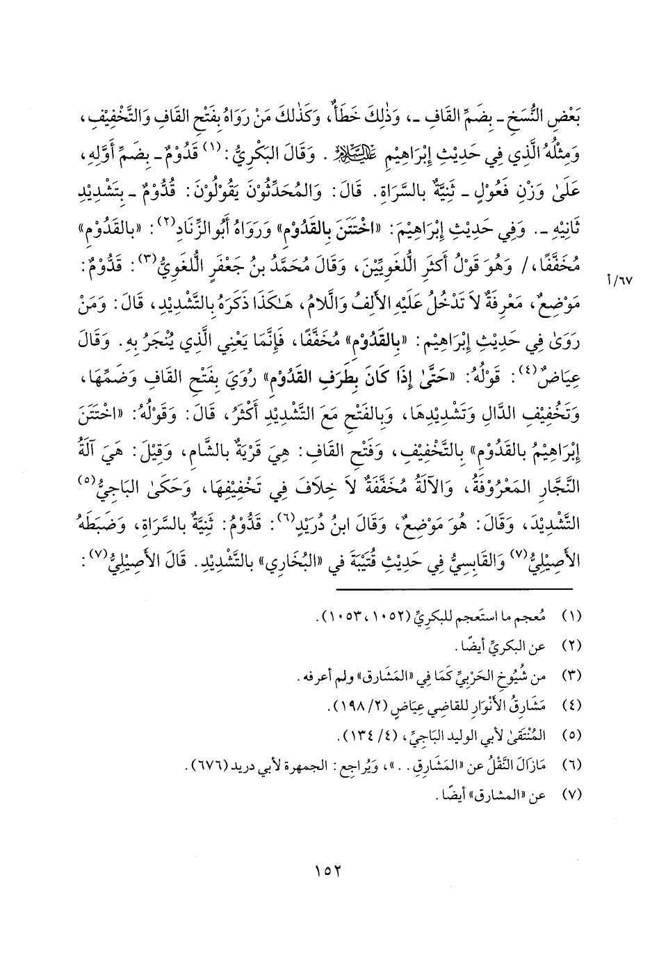 بعض النسخ- بضم القاف-، وذلك خطأ، وكذلك من رواه بفتح القاف والتخفيف، ومثله الذي في حديث إبراهيم عليه السلام. وقال البكري: قدوم- بضم أوله، على وزن فعول- ثنية بالسراة. قال: والمحدثون يقولون: قدوم- بتشديد ثانية-. وفي حديث إبراهيم: "اختتن بالقدوم" ورواه أبو الزناد: "بالقدوم" مخففاً،/67/أوهو قول أكثر اللغويين، وقال محمد بن جعفر اللغوي: قدوم: موضع، معرفة لا تدخل عليه الألف واللام، هكذا ذكره بالتشديد، قال: ومن روى في حديث إبراهيم: "بالقدوم" مخففاً، فإنما يعني الذي ينجر به. وقال عياض: قوله: "حتى إذا كان بطرف القدوم" روي بفتح القاف وضمها، وتخفيف الدال وتشديدها، وبالفتح مع التشديد أكثر، قال: وقوله: "اختتن إبراهيم بالقدوم" بالتخفيف، وفتح القاف: هي قرية بالشام، وقيل: هي آلة النجار المعروفة، والآلة مخففة لا خلاف في تخفيفها، وحكى الباجي التشديد، وقال: هو موضع، وقال ابن دريد: قدوم: ثنية بالسراة، وضبطه الأصيلي والقابسي في حديث قتيبة في "البخاري" بالتشديد. قال الأصيلي: