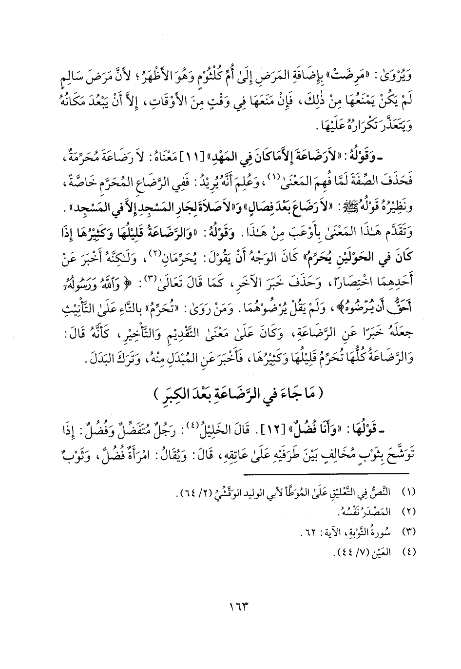 - وقوله: "لا رضاعة إلا ما كان في المهد" [11] معناه: لا رضاعة محرمة، فحذف الصفة لما فهم المعنى، وعلم أنه يريد: ففي الرضاع المحرم خاصة، ونظيره قوله صلى الله عليه وسلم: "لا رضاع بعد فصال" و"لا صلاة لجار المسجد إلا في المسجد". وتقدم هذا المعنى بأوعب من هذا. وقوله: "والرضاعة قليلها وكثيرها إذا كان في الحولين يحرم" كان الوجه أن يقول: يحرمان، ولكنه أخبر عن أحدهما اختصاراً، وحذف خبر الآخر، كما قال تعالى: {وَاللَّهُ وَرَسُولُهُ أَحَقُّ أَنْ يُرْضُوهُ}، ولم يقل يرضوهما. ومن روى: "تحرم" بالتاء على التأنيث جعله خبراً عن الرضاعة، وكان على معنى التقديم والتأخير، كأنه قال: والرضاعة كلها تحرم قليلها وكثيرها، فأخبر عن المبدل منه، وترك البدل.