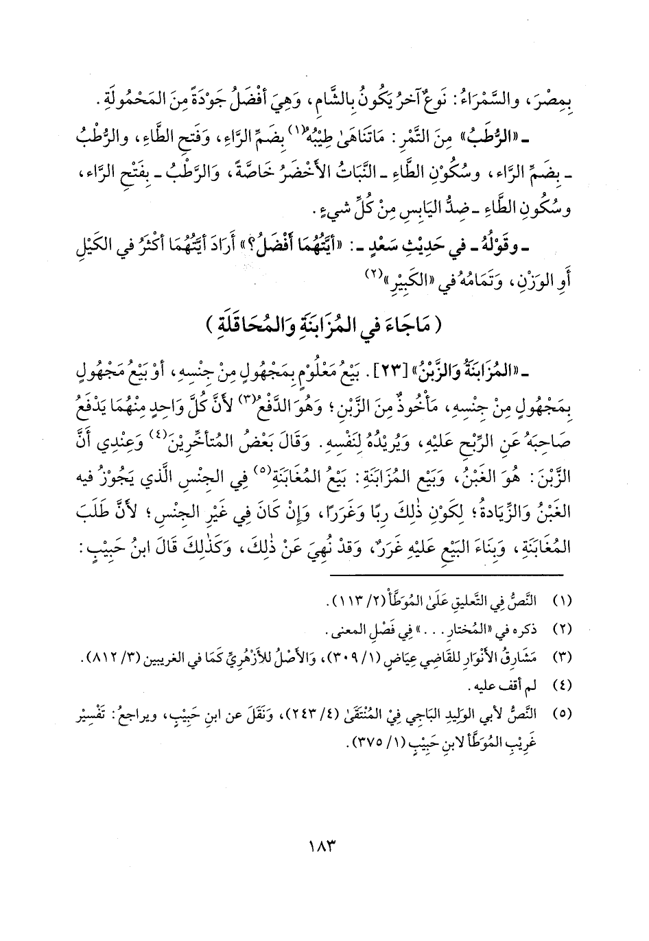 - "المزابنة والزبن" [23]. بيع معلوم بمجهول من جنسه، أو بيع مجهول بمجهول من جنسه، مأخوذ من الزبن؛ وهو الدفع لأن كل واحد منهما يدفع صاحبه عن الربح عليه، ويريده لنفسه. وقال بعض المتأخرين وعندي أن الزبن: هو الغبن، وبيع المزابنة: بيع المغابنة في الجنس الذي يجوز فيه الغبن والزيادة؛ لكون ذلك رباً وغرراً، وإن كان في غير الجنس؛ لأن طلب المغابنة، وبناء البيع عليه غرر، وقد نهي عن ذلك، وكذلك قال ابن حبيب: