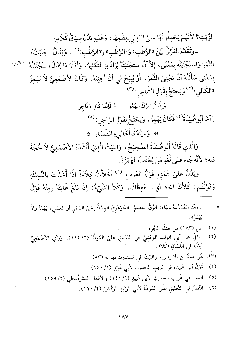- وتقدم الفرق بين "الرطب" و"الرطب" و"الرطب". ويقال: جنيت/ 70/ب الثمر واستجنيته بمعنى، إلا أن استجنيته يراد به التكثير، وأكثر ما يقال استجنيته بمعنى سألته أن يجني الثمر، أو يبيح لي أن أجنيه. وكان الأصمعي لا يهمز "الكالي" ويحتج بقول الشاعر: