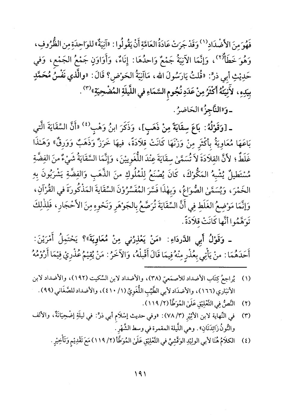 فهو من الأضداد وقد جرت عادة العامة أن يقولوا: "آنية" للواحدة من الظروف، وهو خطأ، وإنما الآنية جمع واحدها: إناء، وأواون جمع الجمع، وفي حديث أبي ذر: "قلت يا رسول الله، ما آنية الحوض؟ قال: "والذي نفس محمد بيده، لآنيته أكثر من عدد نجوم السماء في الليلة المضحية".