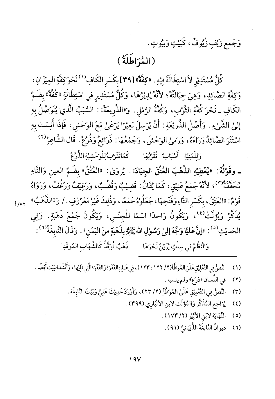 كل مستدير لا استطالة فيه. "كفة" [39] بكسر الكاف نحو كفة الميزان، وكفة الصائد، وهي حبالته؛ لأنه يديرها، وكل مستدير في استطالة "كفة" بضم الكاف- نحو كفة الثوب، وكفة الرمل. و"الذريعة": السبب الذي يتوصل به إلى الشيء. وأصل الذريعة: أن يرسل بعيراً يرعى مع الوحش، فإذا أنست به استتر الصائد وراءه، ورمى الوحش، وجمعها: ذرائع وذرع. قال الشاعر: