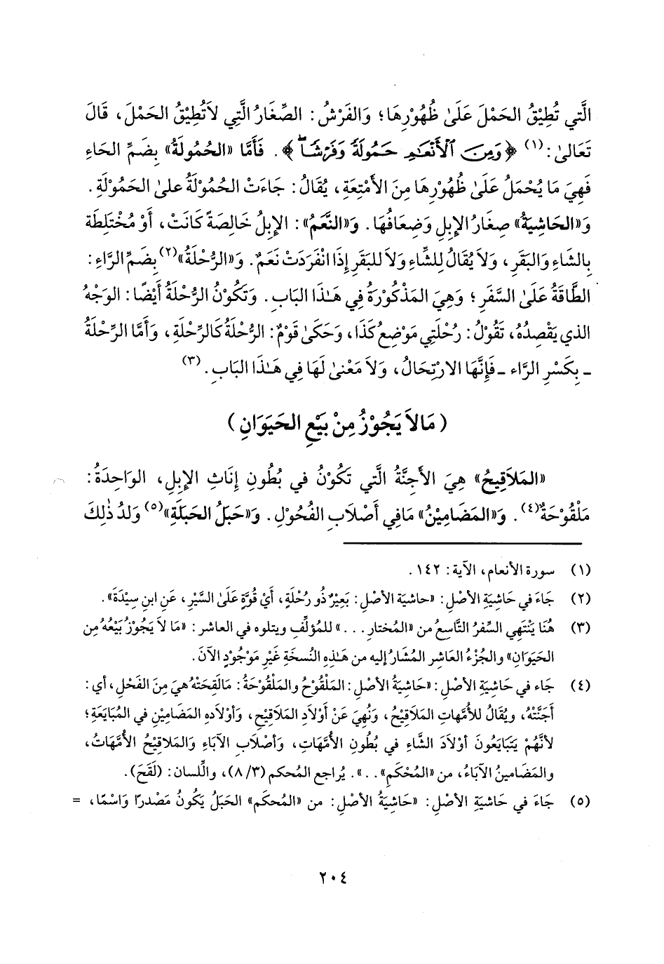التي تطيق الحمل على ظهورها؛ والفرش: الصغار التي لا تطيق الحمل، قال تعالى: {وَمِنْ الأَنْعَامِ حَمُولَةً وَفَرْشاً}. فأما "الحمولة" بضم الحاء فهي ما يحمل على ظهورها من الأمتعة، يقال: جاءت الحمولة على الحمولة. و"الحاشية" صغار الإبل وضعافها. و"النعم": الإبل خالصة كانت، أو مختلطة بالشاء والبقر، ولا يقال للشاء ولا للبقر إذا انفردت نعم. و"الرحلة" بضم الراء: الطاقة على السفر؛ وهي المذكورة في هذا الباب. وتكون الرحلة أيضاً: الوجه الذي يقصده، تقول: رحلتي موضع كذا، وحكى قوم: الرحلة كالرحلة، وأما الرحلة- بكسر الراء- فإنها الارتحال، ولا معنى لها في هذا الباب.