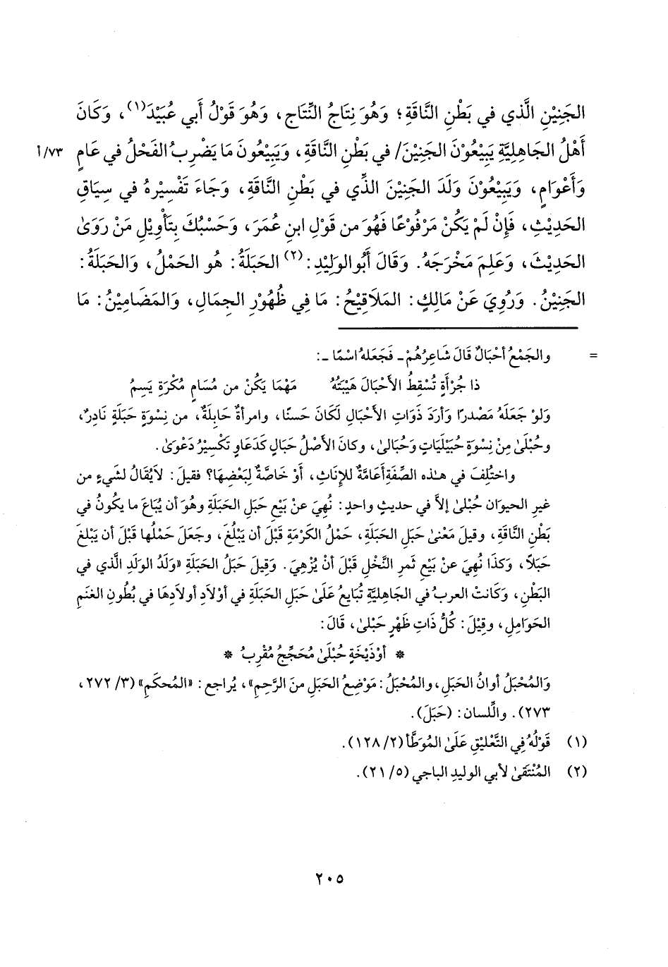 الجنين الذي في بطن الناقة؛ وهو نتاج النتاج، وهو قول أبي عبيد، وكان أهل الجاهلية يبيعون الجنين/ 73/أفي بطن الناقة، ويبيعون ما يضرب الفحل في عام وأعوام، ويبيعون ولد الجنين الذي في بطن الناقة، وجاء تفسيره في سياق الحديث، فإن لم يكن مرفوعاً فهو من قول ابن عمر، وحسبك بتأويل من روى الحديث، وعلم مخرجه. وقال أبو الوليد: الحبلة: هو الحمل، والحبلة: الجنين. وروي عن مالك: الملاقيح: ما في ظهور الجمال، والمضامين: ما