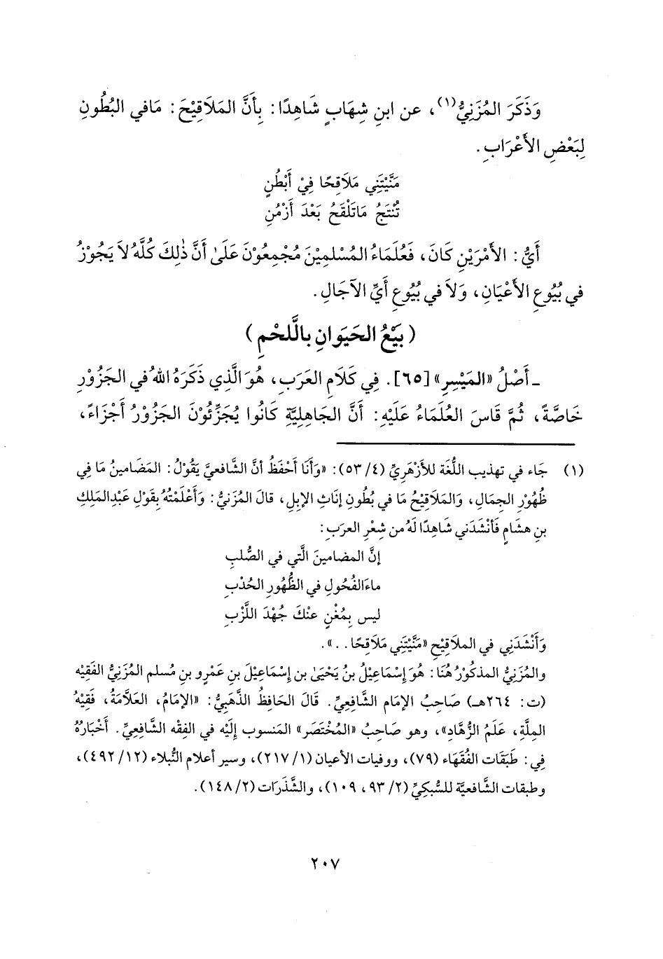 وذكر المزني، عن ابن شهاب شاهداً: بأن الملاقيح: ما في البطون لبعض الأعراب.