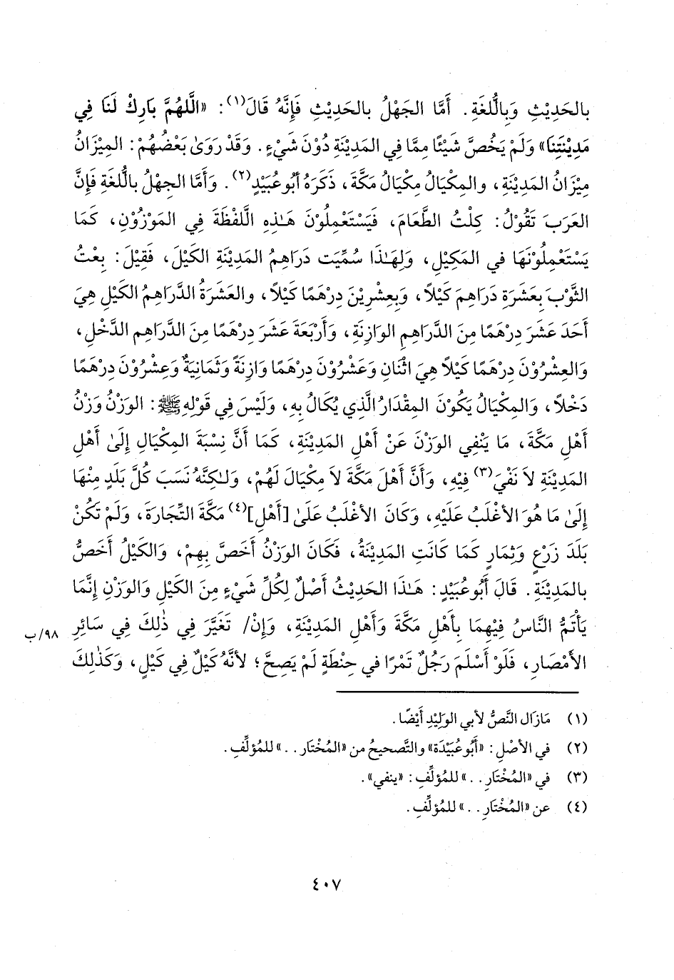 بالحديث وباللغة. أما الجهل بالحديث فإنه قال: "اللهم بارك لنا في مدينتنا" ولم يخص شيئاً مما في المدينة دون شيء. وقد روى بعضهم: الميزان ميزان المدينة، والمكيال مكيال مكة، ذكره أبو عبيد. وأما الجهل باللغة فإن العرب تقول: كلت الطعام، فيستعملون هذه اللفظة في الموزون، كما يستعملونها في المكيل، ولهذا سميت دراهم المدينة الكيل، فقيل: بعت الثوب بعشرة دراهم كيلاً، وبعشرين درهماً كيلاً، والعشرة الدراهم الكيل هي أحد عشر درهماً من الدراهم الوازنة، وأربعة عشرة درهماً من الدراهم الدخل، والعشرون درهماً من الدراهم الوازنة، وأربعة عشر درهماً من الدراهم الدخل، والعشرون درهماً كيلاً هي اثنان وعشرون درهماً وازنة وثمانية وعشرون درهماً دخلاً، والمكيال يكون المقدار الذي يكال به، وليس في قوله صلى الله عليه وسلم: الوزن وزن أهل مكة، ما ينفي الوزن عن أهل المدينة، كما أن نسبة المكيال إلى أهل المدينة لا نفي فيه، وان أهل مكة لا مكيال لهم، ولكنه نسب كل بلد منها إلى ما هو الأغلب عليه، وكان الأغلب على [أهل] مكة التجارة، ولم تكن بلد زرع وثمار كما كانت المدينة، فكان الوزن أخص بهم، والكيل أخص بالمدينة. قال أبو عبيد: هذا الحديث أصل لكل شيء من الكيل والوزن إنما يأتم الناس فيهما بأهل مكة وأهل المدينة، وإن/ 98/ب تغير في ذلك في سائر الأمصار، فلو أسلم رجل تمراً في حنطة لم يصح؛ لأنه كيل في كيل، وكذلك