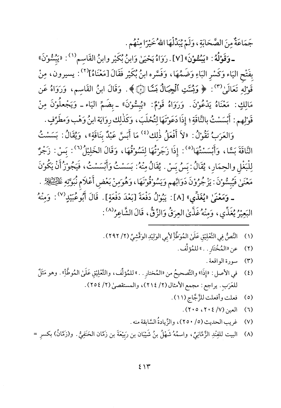 - وقوله: "يبسون" [7]. رواه يحيى وابن بكير وابن القاسم: "يبسون" بفتح الياء وكسر الباء وضمها، وفسره ابن بكير فقال [معناه]: يسيرون، من قوله تعالى: {وَبُسَّتْ الْجِبَالُ بَسّاً (5)}. وقال ابن القاسم، ورواه عن مالك: معناه يدعون. ورواه قوم: "يبسون"- بضم الياء- ويجعلون من قولهم: أبسست بالناقة؛ إذا دعوتها لتحلب، وكذلك رواية ابن وهب ومطرف.