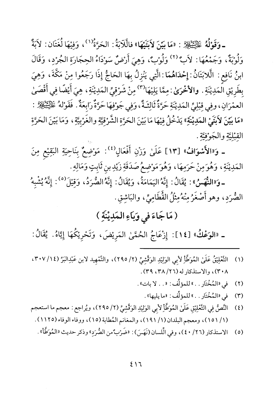 - وقوله عليه السلام: "ما بين لابتيها" فاللابة: الحرة، وفيها لغتان: لابة ولوبة، وجمعها: لاب ولوب، وهي أرض سوداء الحجارة الجرد، وقال ابن نافع: اللابتان: إحداهما: التي ينزل بها الحاج إذا رجعوا من مكة، وهي بطريق المدينة. والأخرى: مما يليها من شرقي المدينة، هي أيضاً في أقصى العمران، وفي قبلي المدينة حرةث الثة، وفي جوفها حرة رابعة. فقوله عليه السلام: "ما بين لابتي المدينة" يدخل فيها ما بين الحرة الشرقية والغربية، وما بين الحرة القبلية والجوفية.