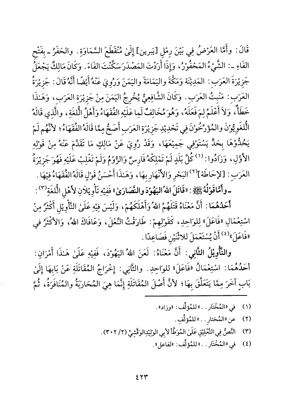 قال: وأما العرض في بين رمل [يبرين] إلى منقطع السماوة. والحفر- بفتح الفاء-: الشيء المحفور، وإذا أردت المصدر سكنت الفاء. وكان مالك يجعل جزيرة العرب: المدينة ومكة واليمامة واليمن وروي عنه أيضاً أنه قال: جزيرة العرب: منبت العرب. وكان الشافعي يخرج اليمن من جزيرة العرب، وهذا خطأ، ولا أعلم لم فعله، وهو مخالف لما عليه الفقهاء وأهل اللغة، والذي قاله اللغويون والمؤرخون في تحديد جزيرة العرب أصح مما قاله الفقهاء؛ لأنهم لم يحدوها بحد يستوفي جميعها، وقد روي عن مالك ما تقدم عنه من قوله الأول، وزادوا: كل بلد لم تملكه فارس والروم ولم تغلب عليه فهو جزيرة العرب: [لإحاطة] البحر والأنهار بها، وهذا أحسن قول قاله الفقهاء فيها.