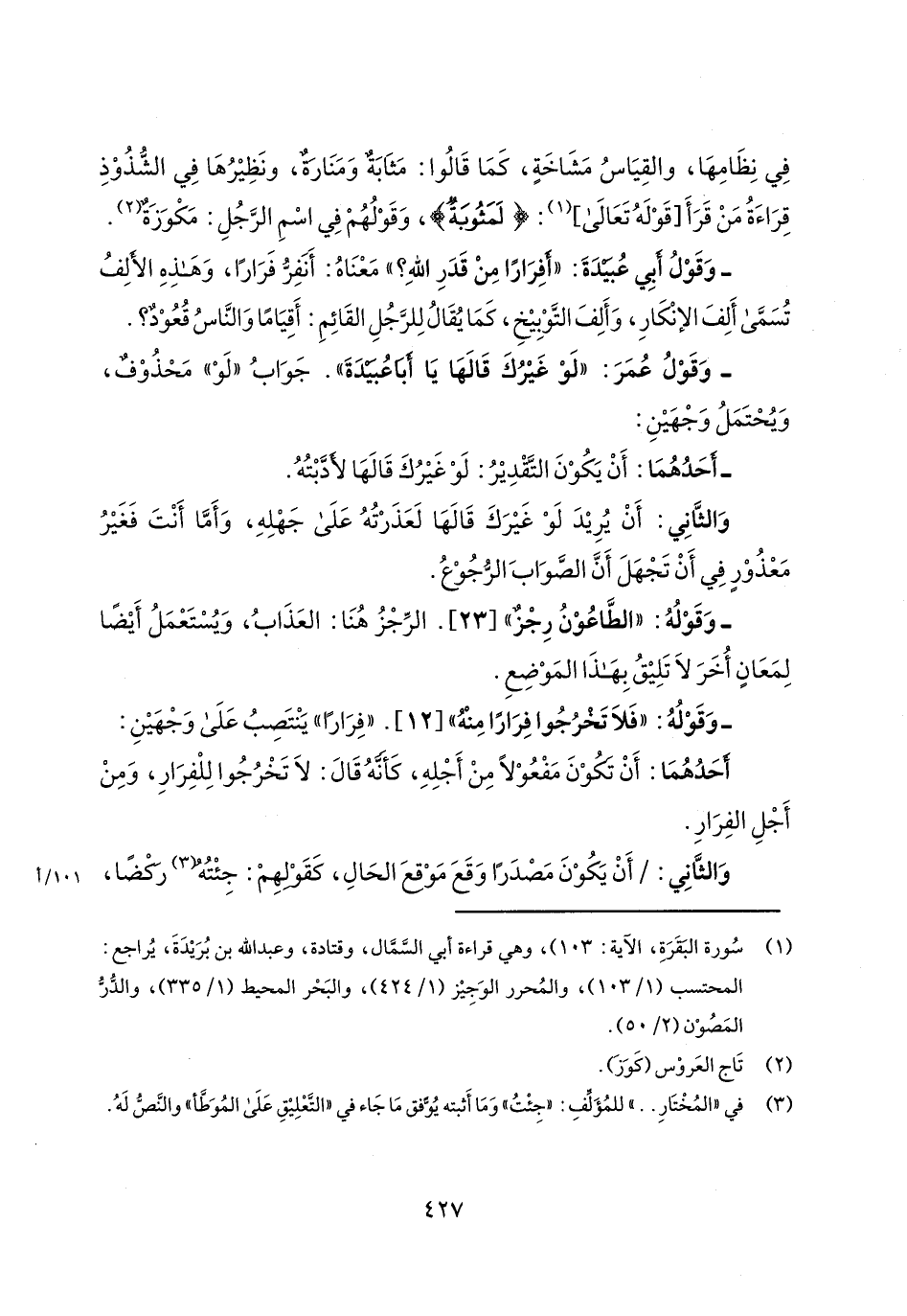 - وقوله: "فلا تخرجوا فراراً منه" [12]. "فراراً" ينتصب على وجهين: