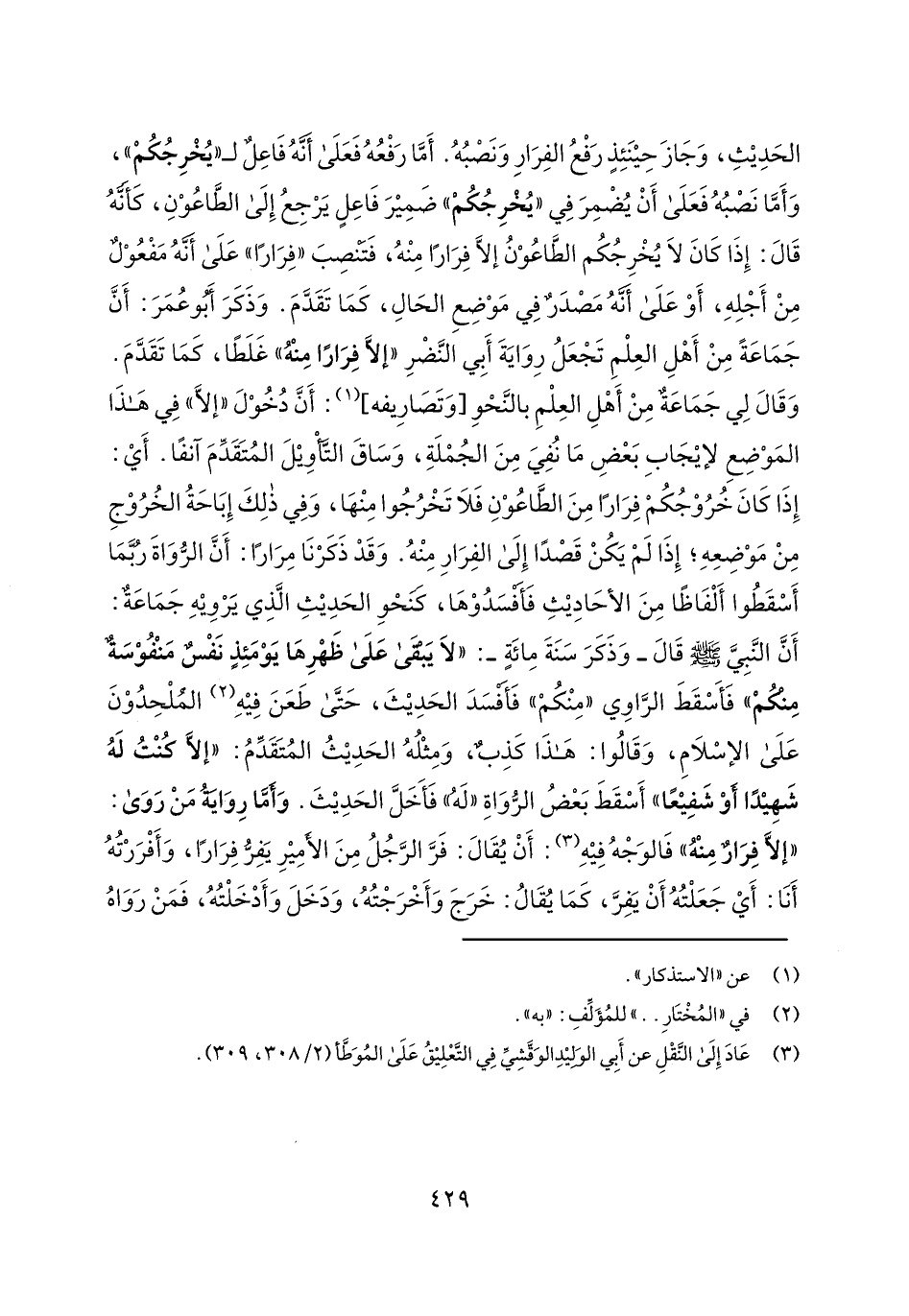 الحديث، وجاز حينئذ رفع الفرار ونصبه. أما رفعه فعلى أنه فاعل لـ "يخرجكم"، وأما نصبه فعلى أن يضمر في "يخرجكم" ضمير فاعل يرجع إلى الطاعون، كأنه قال: إذا كان لا يخرجكم الطاعون إلا فراراً منه، فتنصب "فراراً" على أنه مفعول من أجله، أو على أنه مصدر في موضع الحال، كما تقدم. وذكر أبو عمر: أن جماعة من أهل العلم تجعل رواية أبي النضر "إلا فراراً منه" غلطاً، كما تقدم. وقال لي جماعة من أهل العلم بالنحو [وتصاريفه]: أن دخول "إلا" في هذا الموضع لإيجاب بعض ما نفي من الجملة، وساق التأويل المتقدم آنفاً. أي: إذا كان خروجكم فراراً من الطاعون فلا تخرجوا منها، وفي ذلك إباحة الخروج من موضعه؛ إذا لم يكن قصداً إلى الفرار منه. وقد ذكرنا مراراً: أن الرواة ربما أسقطوا ألفاظاً من الأحاديث فأفسدوها، كنحو الحديث الذي يرويه جماعة: أن النبي صلى الله عليه وسلم قال- وذكر سنة مائة-: "لا يبقى على ظهرها يومئذ نفس منفوسة منكم" فأسقط الراوي "منكم" فأفسد الحديث، حتى طعن فيه الملحدون على الإسلام، وقالوا: هذا كذب، ومثله الحديث المتقدم: "إلا كنت له شهيداً أو شفيعاً" أسقط بعض الرواة "له" فأخل الحديث. وأما رواية من روى: "إلا فرار منه" فالوجه فيه: أن يقال: فر الرجل من الأمير يفر فراراً، وأفررته أنا: أي جعلته أن يفر، كما يقال: خرج وأخرجته، ودخل وأدخلته، فمن رواه