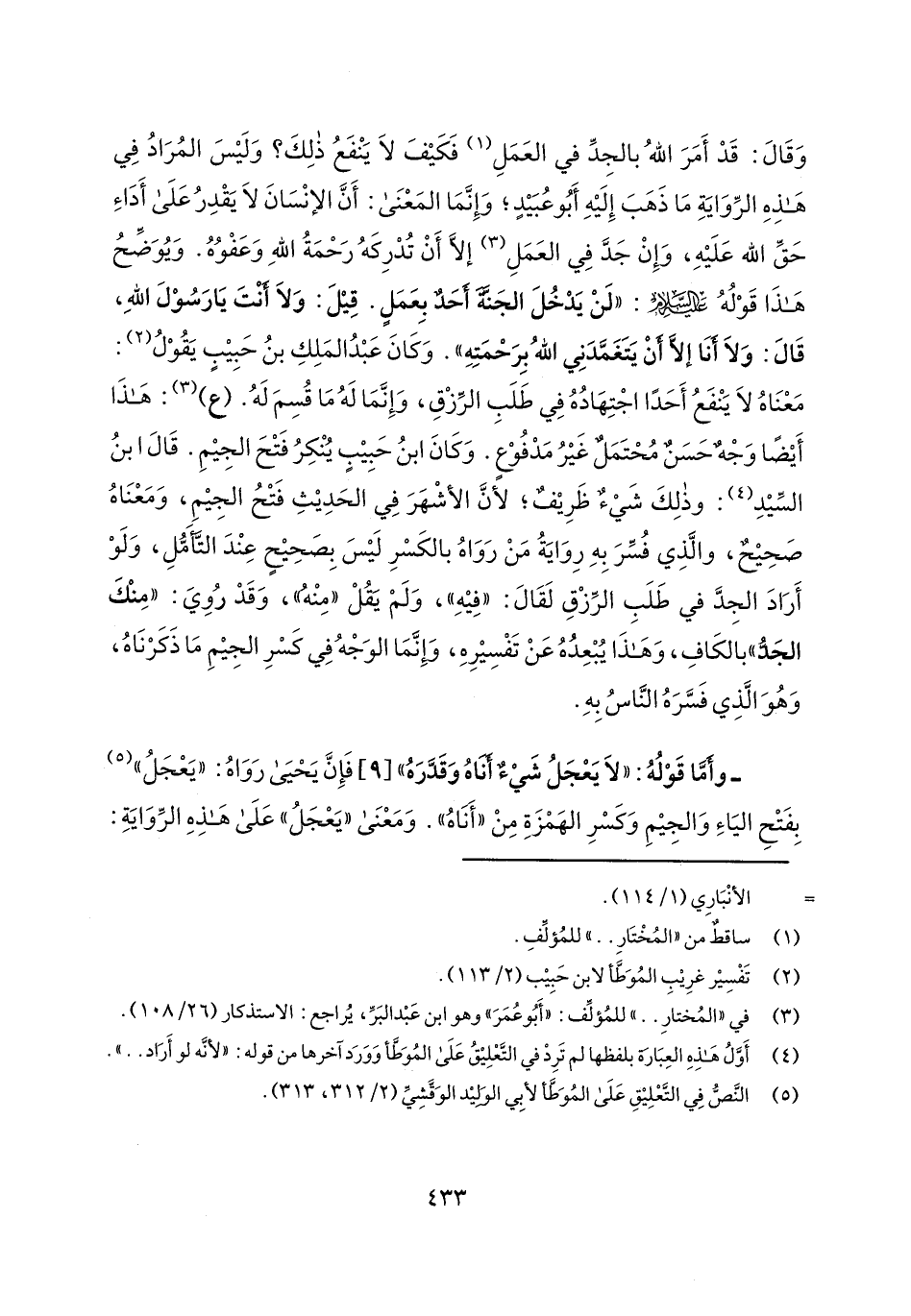 - وأما قوله: "لا يعجل شيء أناه وقدره" [9] فإن يحيى رواه: "يعجل" بفتح الياء والجيم وكسر الهمزة من "أناه". ومعنى "يعجل" على هذه الرواية: