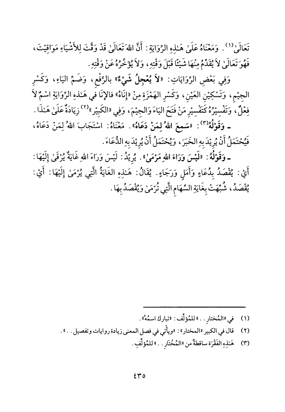 وفي بعض الروايات: "لا يعجل شيء" بالرفع، وضم الياء، وكسر الجيم، وتسكين العين، وكسر الهمزة من "إناه" فالإنا في هذه الرواية اسم لا فعل، وتفسيره كتفسير من فتح الياء والجيم، وفي "الكبير" زيادة على هذا.