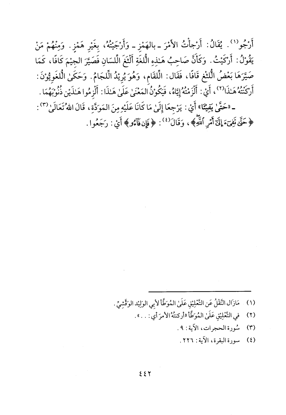 أرجو. يقال: أرجأت الأمر- بالهمز- وأرجيته، بغير همز. ومنهم من يقول: أركيت. وكأن صاحب هذه اللغة الثغ اللسان فصير الجيم كافاً، كما صيرها بعض اللثغ قافاً، فقال: اللقام، وهو يريد اللجام. وحكى اللغويون: أركنته هذا، أي: ألزمته إياه، فيكون المعنى على هذا: ألزموا هذين ذنوبهما.