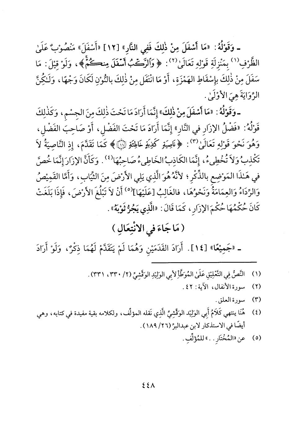 - وقوله: "ما أسفل من ذلك ففي النار" [12] "أسفل" منصوب على الظرف بمنزلة قوله تعالى: {وَالرَّكْبُ أَسْفَلَ مِنْكُمْ}، ولو قيل: ما سفل من ذلك بإسقاط الهمزة، أو ما انتفل من ذلك بالنون لكان وجهاً، ولكن الرواية هي الأولى.