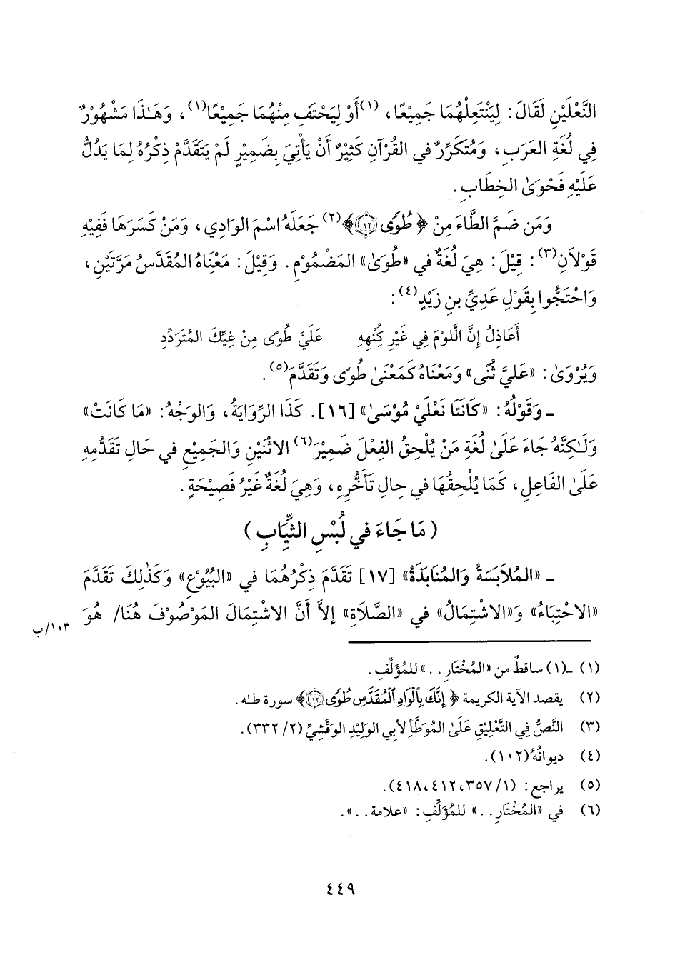 - وقوله: "كانتا نعلي موسى" [16]. كذا الرواية، والوجه: "ما كانت" ولكنه جاء على لغة من يلحق الفعل ضمير الاثنين والجميع في حال تقدمه على الفاعل، كما يلحقها في حال تأخره، وهي لغة غير فصيحة.