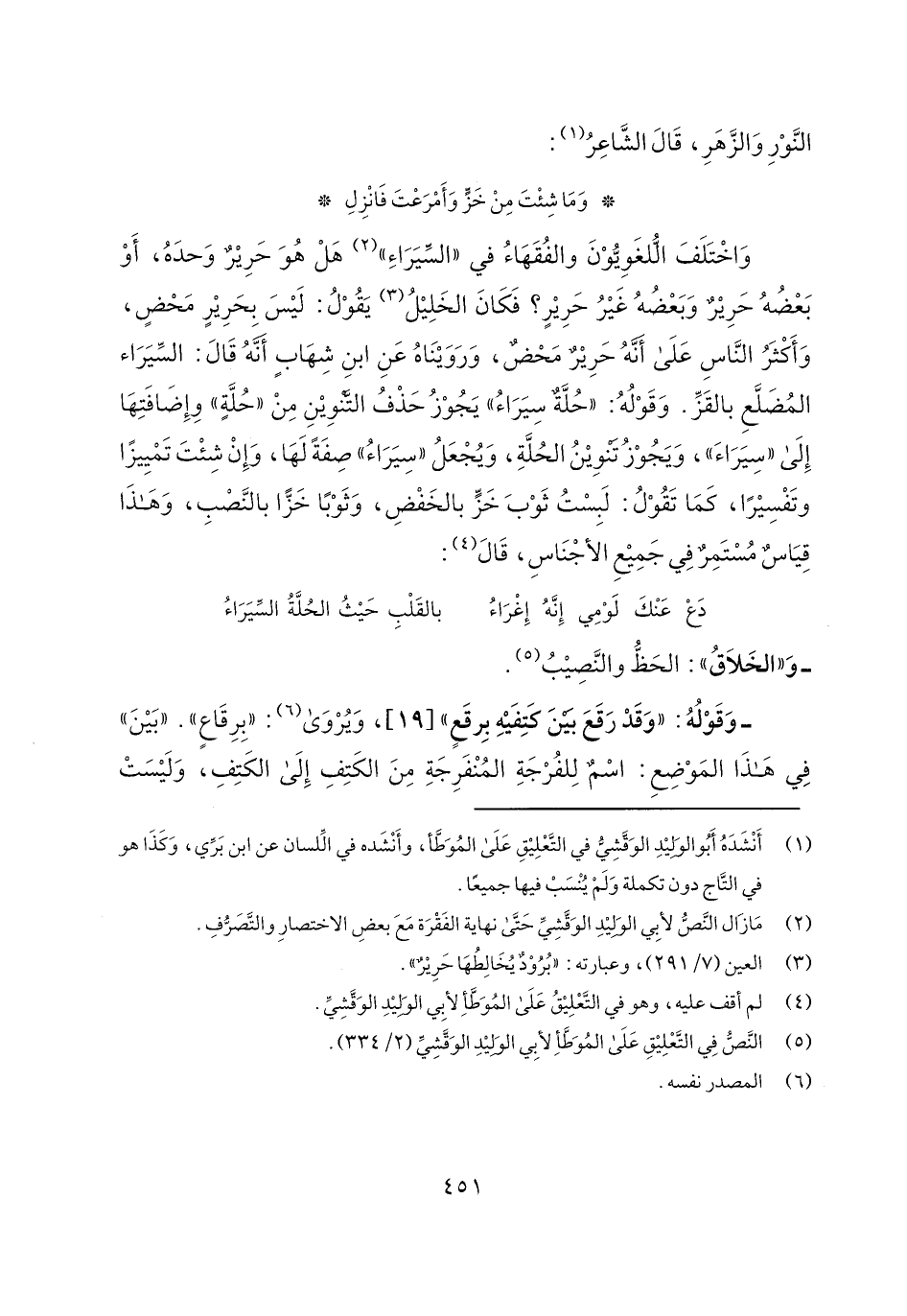 واختلف اللغويون والفقهاء في "السيراء" هل هو حرير وحده، أو بعضه حرير وبعضه غير حرير؟ فكان الخليل يقول: ليس بحرير محض، وأكثر الناس على أنه حرير محض، ورويناه عن ابن شهاب أنه قال: السيراء المضلع بالقز. وقوله: "حلة سيراء" يجوز حذف التنوين من "حلة" وإضافتها إلى "سيراء"، ويجوز تنوين الحلة، ويجعل "سيراء" صفة لها، وإن شئت تمييزاً وتفسيراً، كما تقول: لبست ثوب خز بالخفض، وثوباً خزا بالنصب، وهذا قياس مستمر في جميع الأجناس، قال:
