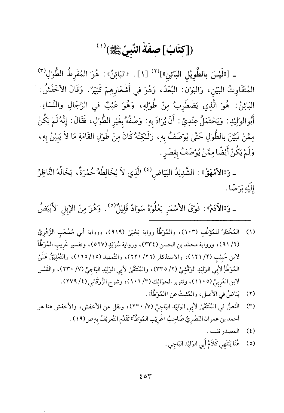 -["ليس بالطويل البائن"] [1]. "البائن": هو المفرط الطول المتفاوت البين، والبون: البعد، وهو في أشعارهم كثير. وقال الأخفش: البائن: هو الذي يضطرب من طوله، وهو عيب في الرجال والنساء. أبو الوليد: ويحتمل عندي: أن يراد به: وصفه بغير الطول، فقال: إنه لم يكن ممن تبين بالطول حتى يوصف به، ولكنه كان من طول القامة ما لا يبين به، ولم يكن أيضاً ممن يوصف بقصر.