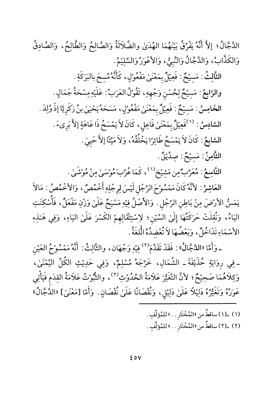 - وأما "الدجال": فقد تقدم فيه وجهان، والثالث: أنه ممسوح العين- في رواية حذيفة- الشمال، خرجه مسلم، وفي حديث الكل اليمنى، وكلاهما صحيح؛ لأن التغير علامة الحدوث، والثبوت علامة القدم فيأتي عوره وتغيره دليلاً على دليل، ونقصاناً على نقصان. وأما [معنى] "الدجال"