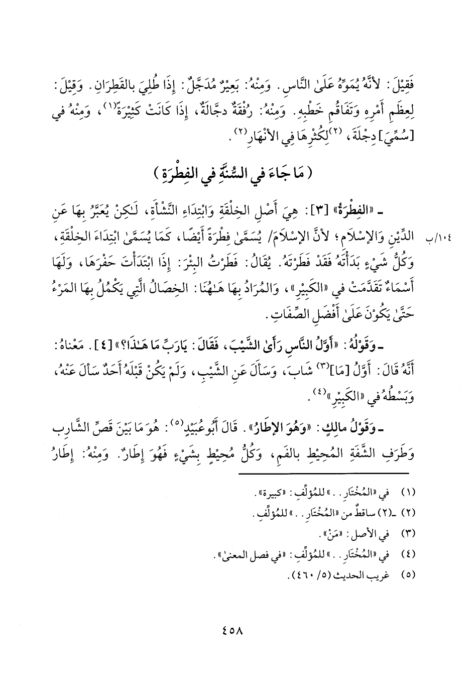 - "الفطرة" [3]: هي أصل الخلقة وابتداء النشأة، لكن يعبر بها عن الدين والإسلام؛ لأن الإسلام/ 104/ ب يسمى فطرة أيضاً، كما يسمى ابتداء الخلقة، وكل شيء بدأته فقد فطرته. يقال: فطرت البئر: إذا ابتدأت حفرها، ولها أسماء تقدمت في "الكبير"، والمراد بها ههنا: الخصال التي يكمل بها المرء حتى يكون على أفضل الصفات.