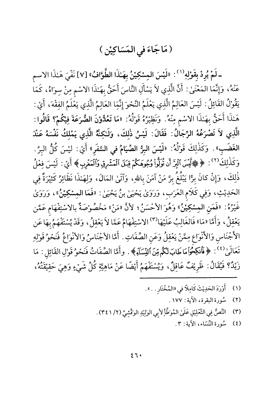 - لم يرد بقوله: "ليس المسكين بهذا الطواف" [7] نفي هذا الاسم عنه، وإنما المعنى: أن الذي لا يسأل الناس أحق بهذا الاسم من سواه، كما يقول القائل: ليس العالم الذي يعلم النحو إنما العالم الذي يعلم الفقه، أي: هذا أحق بهذا الاسم منه. ونظيره قوله: "ما تعدون الصرعة فيكم؟ قالوا: الذي لا تصرعه الرجال: فقال: ليس ذلك، ولكنه الذي يملك نفسه عند الغضب". وكذلك قوله: "ليس البر الصيام في السفر" أي: ليس كل البر. وكذلك: {لَيْسَ الْبِرَّ أَنْ تُوَلُّوا وُجُوهَكُمْ قِبَلَ الْمَشْرِقِ وَالْمَغْرِبِ} أي: ليس فعل ذلك، وإن كان براً يبلغ بر من آمن بالله، وآتى المال، ولهذا نظائر كثيرة في الحديث، وفي كلام العربن وروى يحيى بن يحيى: "فما المسكين"، وروى غيره: "فمن المسكين" وهو الأحسن؛ لأن "من" مخصوصة بالاستفهام عمن يعقل، وأما "ما" فالغالب عليها الاستفهام عما لا يعقل، وقد يستفهم بها عن الأجناس والأنواع ممن يعقل وعن الصفات. أما الأجناس والأنواع فنحو قوله تعالى: {فَانكِحُوا مَا طَابَ لَكُمْ مِنَ النِّسَاءِ}. وأما الصفات فنحو قول القائل: ما زيد؟ فيقال: ظريف عاقل، ويستفهم أيضاً عن ماهية كل شيء وهي حقيقته،