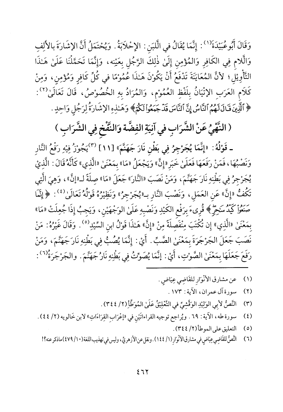 - قوله: "إنما يجرجر في بطن نار جهنم" [11] يجوز فيه رفع النار ونصبها، فمن رفعها فعلى خبر "إن" ويجعل "ما" بمعنى "الذي" كأنه قال: الذي يجرجر في بطنه نار جهنم، ومن نصب "النار" جعل "ما" صلة لـ "إن"، وهي التي تكف "إن" عن العمل، ونصب النار بـ "يجرجر" ونظيره قوله تعالى: {إِنَّمَا صَنَعُوا كَيْدُ سَاحِرٍ} قرئ برفع الكيد ونصبه على الوجهين، ويجب إذا جعلت "ما" بمعنى "الذي" إن تكتب منفصلة من "إن" هذا قول ابن السيد. وقال غيره: من نصب جعل الجرجرة بمعنى الصب. أي: إنما يصب في بطنه نار جهنم، ومن رفع جعلها بمعنى الصوت، أي: إنما يصوت في بطنه نار جهنم. والجرجرة: