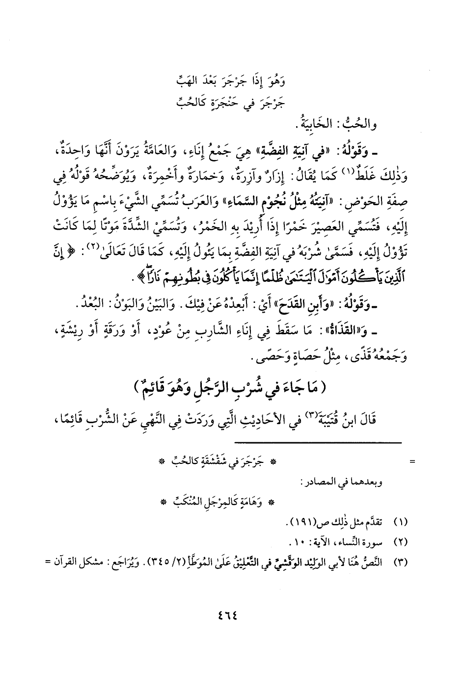- وقوله: "في آنية الفضة" هي جمع إناء، والعامة يرون أنها واحدة، وذلك غلط كما يقال: إزار وآزرة، وخمارة وأخمرة، ويوضحه قوله في صفة الحوض: "آنيته مثل نجوم السماء" والعرب تسمي الشيء باسم ما يؤول إليه، فتسمي العصير خمراً إذا أريد به الخمر، وتسمي الشدة موتاً لما كانت تؤول إليه، فتسمى شربه في آنية الفضة بما يئول إليه، كما قال تعالى: {إِنَّ الَّذِينَ يَاكُلُونَ أَمْوَالَ الْيَتَامَى ظُلْماً إِنَّمَا يَاكُلُونَ فِي بُطُونِهِمْ نَاراً}.