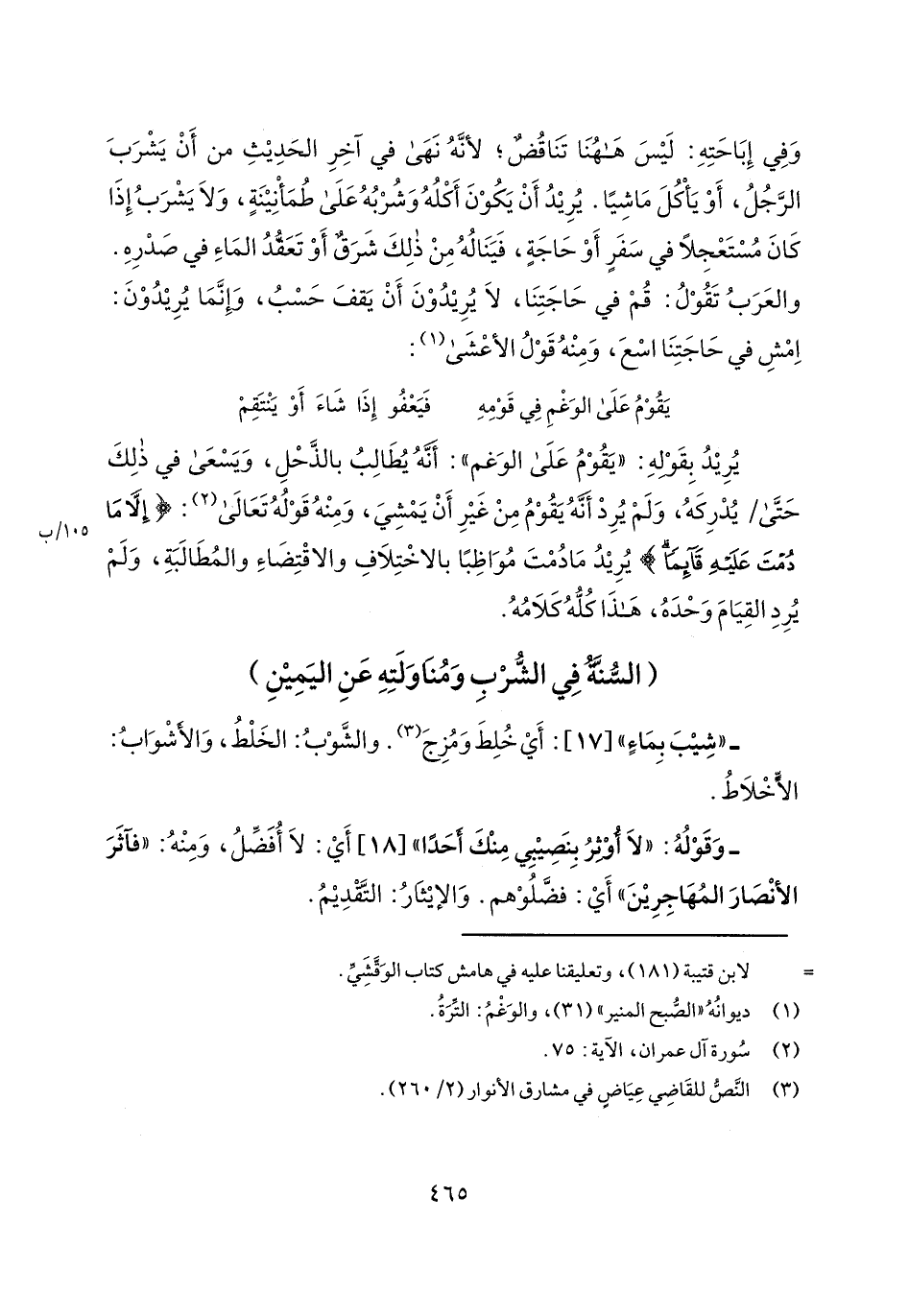 وفي إباحته: ليس ههنا تناقض؛ لأنه نهى في آخر الحديث من أن يشرب الرجل، أو يأكل ماشياً. يريد أن يكون أكله وشربه على طمأنينة، ولا يشرب إذا كان مستعجلاً في سفر أو حاجة، فيناله من ذلك شرق أو تعقد الماء في صدره. والعرب تقول: قم في حاجتنا، لا يريدون أن يقف حسب، وإنما يريدون: امش في حاجتنا اسع، ومنه قول الأعشى: