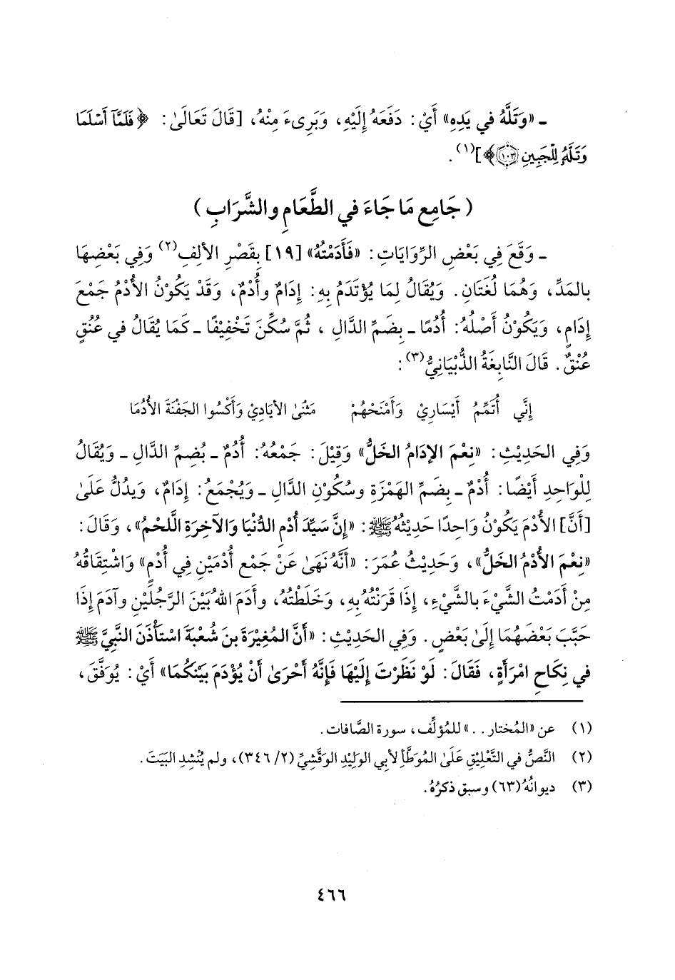 - وقع في بعض الروايات: "فأدمته" [19] بقصر الألف وفي بعضها بالمد، وهما لغتان. ويقال لما يؤتدم به: إدام وأدم، وقد يكون الأدم جمع إدام، ويكون أصله: أدماً- بضم الدال، ثم سكن تخفيفاً- كما يقال في عنق عنق. قال النابغة الذبياني:
