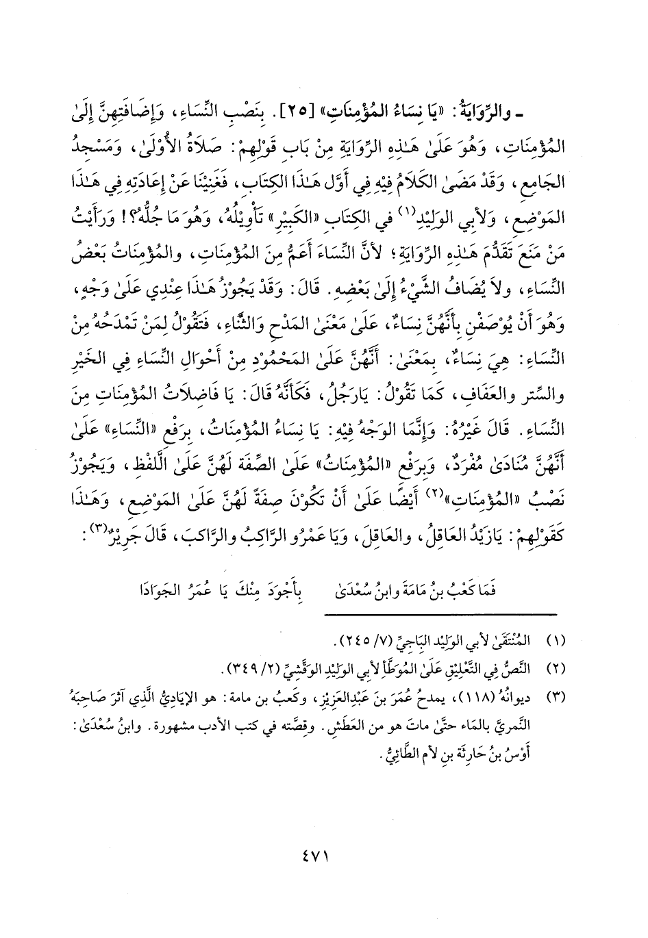 - والرواية: "يا نساء المؤمنات" [25]. بنصب النساء، وإضافتهن إلى المؤمنات، وهو على هذه الرواية من باب قولهم: صلاة الأولى، ومسجد الجامع، وقد مضى الكلام فيه في أول هذا الكتاب، فغنينا عن إعادته في هذا الموضع، ولأبي الوليد في الكتاب "الكبير" تأويله، وهو ما جله؟! ورأيت من منع تقدم هذه الرواية؛ لأن النساء أعم من المؤمنات، والمؤمنات بعض النساء، ولا يضاف الشيء إلى بعضه. قال: وقد يجوز هذا عندي على وجه، وهو أن يوصفن بأنهن نساء، على معنى المدح والثناء، فتقول لمن تمدحه من النساء: هي نساء، بمعنى: أنهن على المحمود من أحوال النساء في الخير والستر والعفاف، كما تقول: يا رجل، فكأنه قال: يا فاضلات المؤمنات من النساء. قال غيره: وإنما الوجه فيه: يا نساء المؤمنات، برفع "النساء" على أنهن منادى مفرد، وبرفع "المؤمنات" على الصفة لهن على اللفظ، ويجوز نصب "المؤمنات" أيضاً على أن تكون صفة لهن على الموضع، وهذا كقولهم: يا زيد العاقل، والعاقل، ويا عمرو الراكب والراكب، قال جرير: