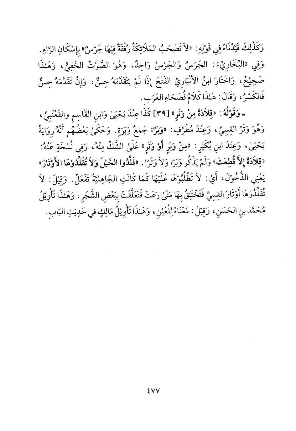 - وقوله: "قلادة من وتر" [39] كذا عند يحيى وابن القاسم والقعنبي، وهو وتر القسي، وعند مطرف: "وبر" جمع وبرة. وحكى بعضهم أنه رواية يحيى، وعند ابن بكير: "من وبر أو وتر" على الشك منه، وفي نسخة عنه: "قلادة إلا قطعت" ولم يذكر وبراً ولا وتراً. "قلدوا الخيل ولا تقلدوها الأوتار" يعني الذحول، أي: لا تطلبوها عليها كما كانت الجاهلية تفعل. وقيل: لا تقلدوها أوتار القسي فتختنق بها متى رعت فتعلقت ببعض الشجر، وهذا تأويل محمد بن الحسن، وقيل: معناه للعين، وهذا تأويل مالك في حديث الباب.