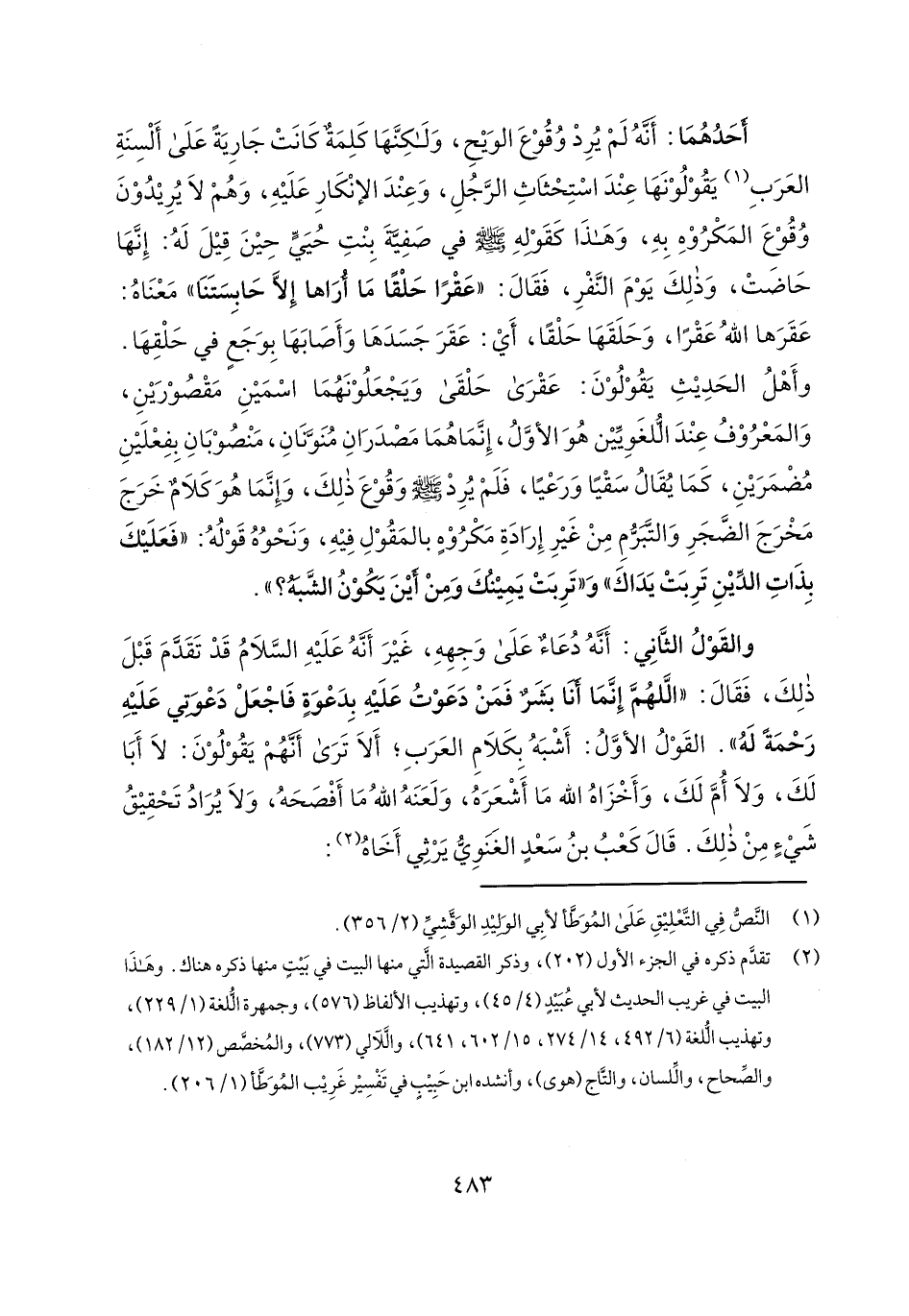 والقول الثاني: أنه دعاء على وجهه، غير أنه عليه السلام قد تقدم قبل ذلك، فقال: "اللهم إنما أنا بشر فمن دعوت عليه بدعوة فاجعل دعوتي عليه رحمة له". القول الأول: أشبه بكلام العرب؛ ألا ترى أنهم يقولون: لا أبا لك، ولا أم لك، وأخزاه الله ما أشعره، ولعنه الله ما أفصحه، ولا يراد تحقيق شيء من ذلك. قال كعب بن سعد الغنوي يرثي أخاه: