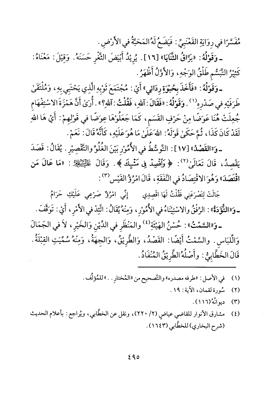 - و"القصد" [17]: التوسط في الأمور بين الغلو والتقصير. يقال: قصد يقصد، قال تعالى: {وَاقْصِدْ فِي مَشْيِكَ}. وقال عليه السلام: "ماعال من اقتصد" وهو الاقتصاد في النفقة، قال امرؤ القيس: