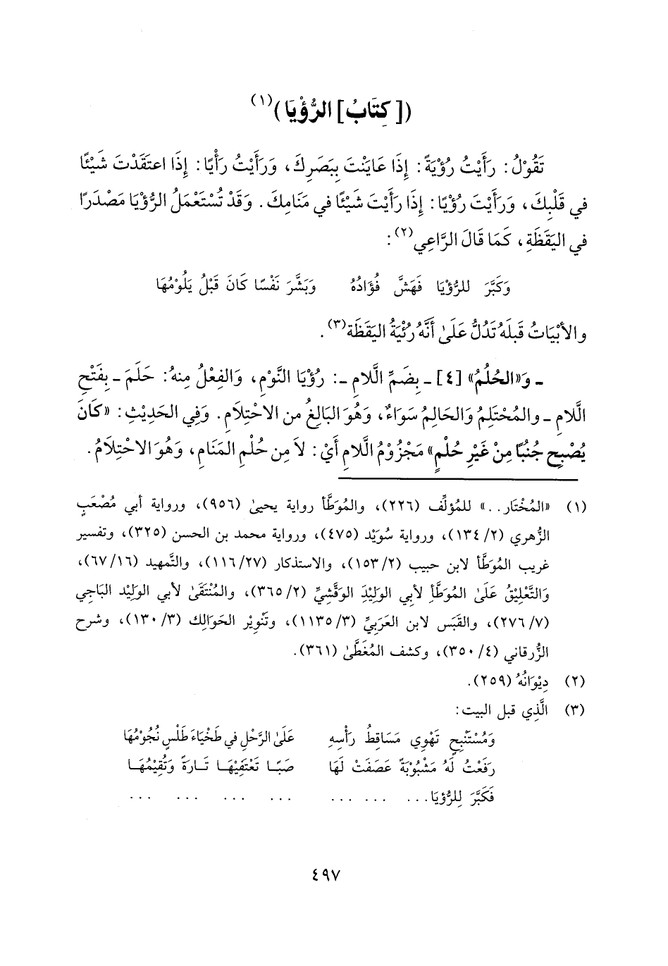 - و"الحلم" [4]- بضم اللام-: رؤيا النوم، والفعل منه: حلم- بفتح اللام- والمحتلم والحالم سواء، وهو البالغ من الاحتلام. وفي الحديث: "كان يصبح جنباً من غير حلم" مجزوم اللام أي: لا من حلم المنام، وهو الاحتلام.