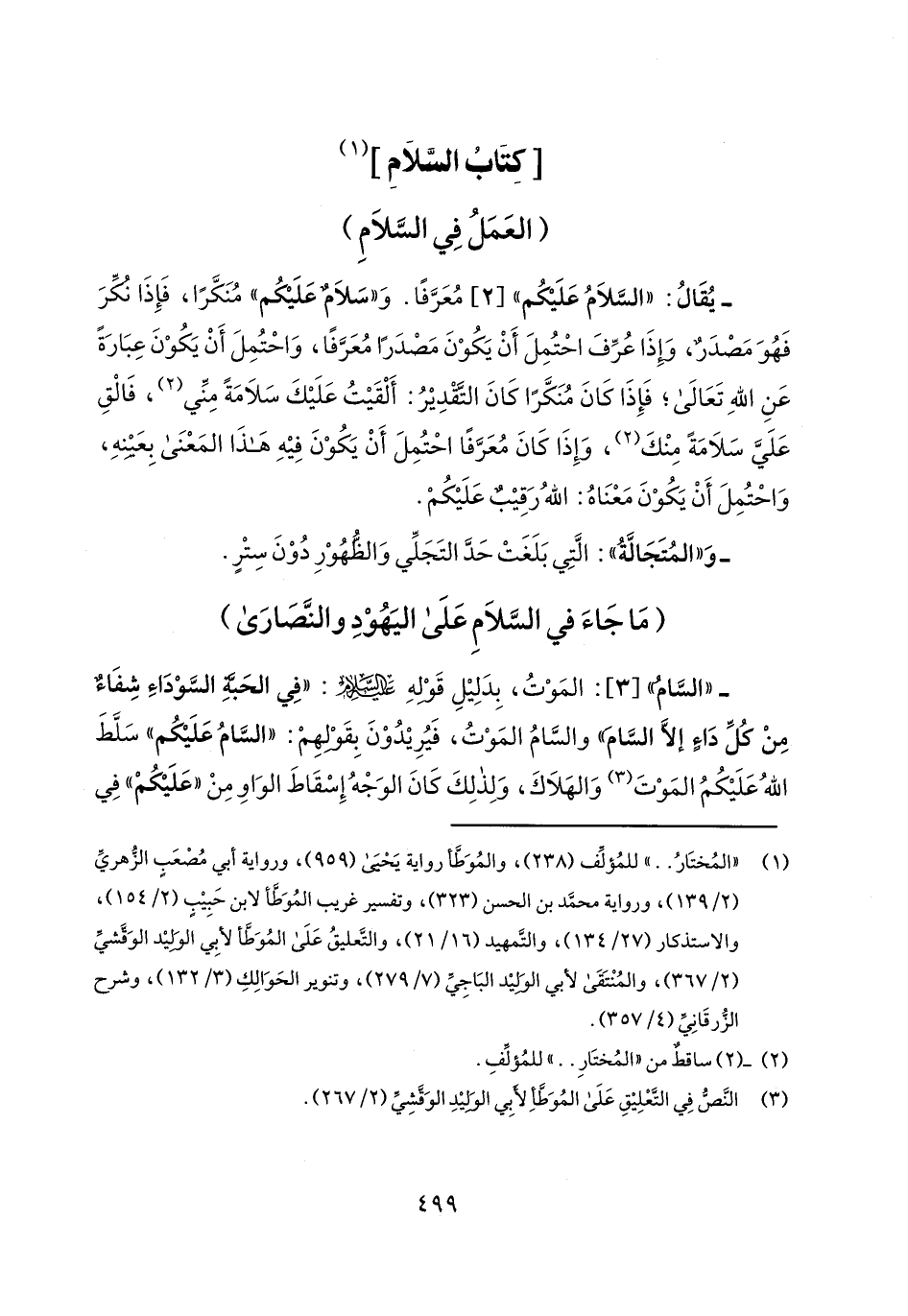 - يقال: "السلام عليكم" [2] معرفاً. و"سلام عليم" منكراً، فإذا نكر فهو مصدر، وإذا عرف احتمل أن يكون مصدراً معرفاً، واحتمل أن يكون عبارة عن الله تعالى؛ فإذا كان منكراً كان التقدير: ألقيت عليك سلامة مني، فالق علي سلامة منك، وإذا كان معرفاً احتمل أن يكون فيه هذا المعنى بعينه، واحتمل أن يكون معناه: الله رقيب عليكم.
