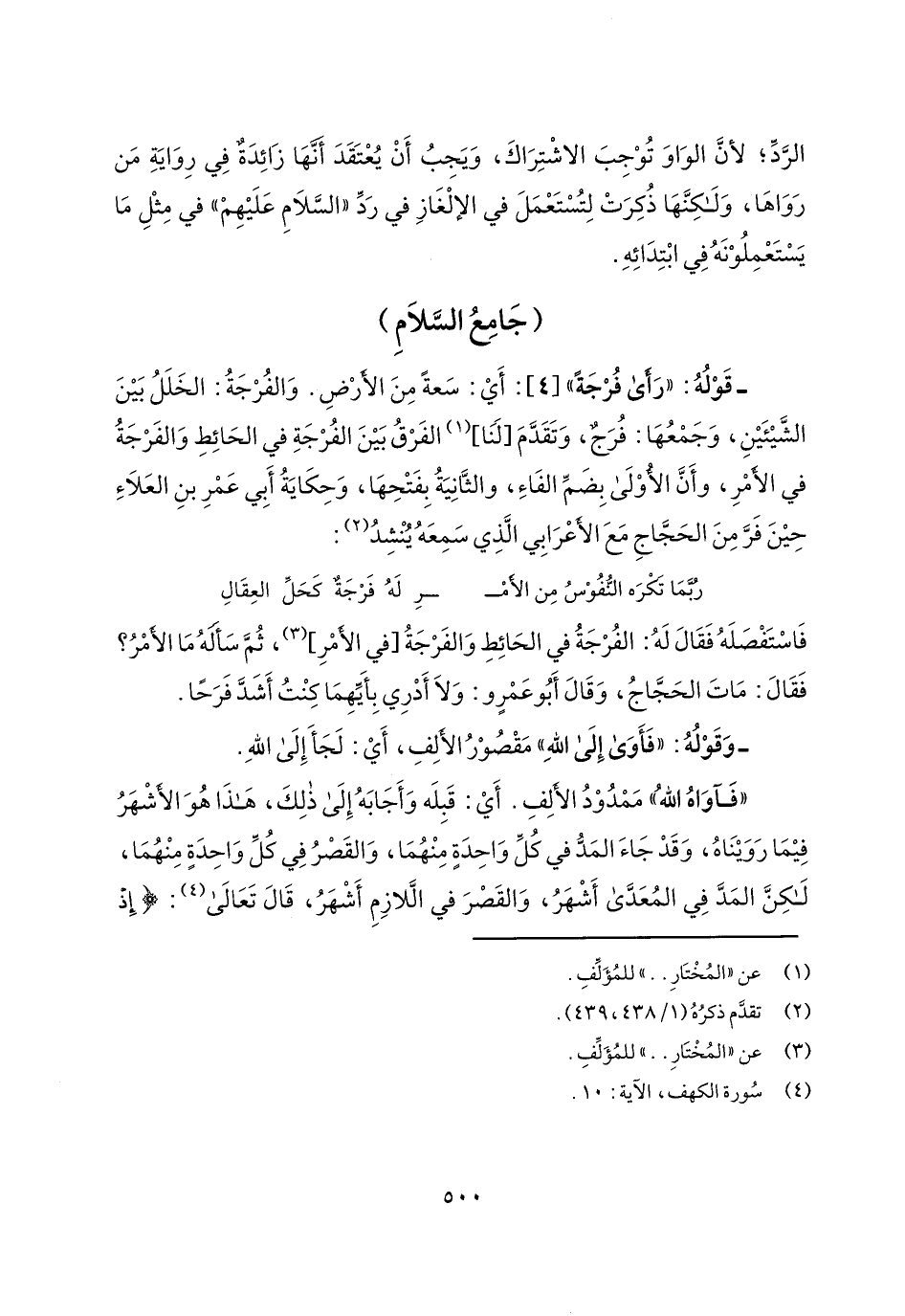 - قوله: "رأى فرجة" [4]: أي: سعة من الأرض. والفرجة: الخلل بين الشيئين، وجمعها: فرج، وتقدم [لنا] الفرق بين الفرجة في الحائط والفرجة في الأمر، وأن الأولى بضم الفاء، والثانية بفتحها، وحكاية أبي عمر بن العلاء حين فر من الحجاج مع الأعرابي الذي سمعه ينشد: