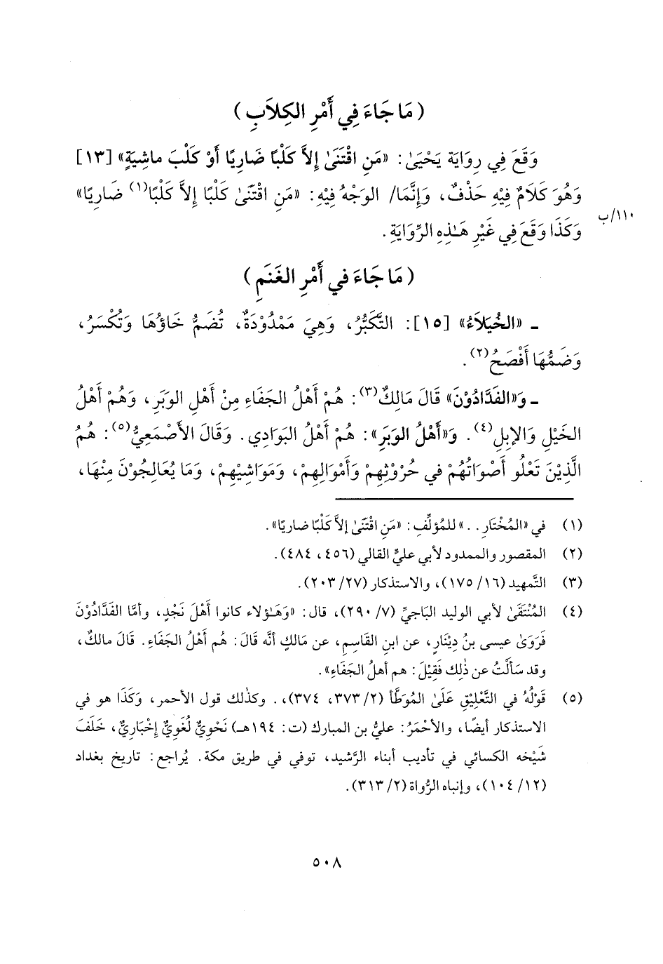 وقع في رواية يحيى: "من اقتنى إلا كلباً ضارياً أو كلب ماشية" [13] وهو كلام فيه حذف، وإنما/ 110/ب الوجه فيه: "من اقتنى كلباً إلا كلباً ضارياً" وكذا وقع في غير هذه الرواية.
