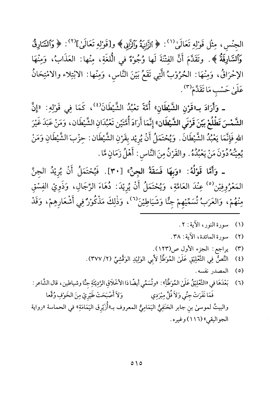 - وأما قوله: "وبها فسقة الجن" [30]. فيحتمل أن يريد الجنس المعروفين عند العامة، ويحتمل أن يريد: دهاء الرجال، وذوي الفسق منهم، والعرب تسميهم جناً وشياطين، وذلك مذكور في أشعارهم، وقد