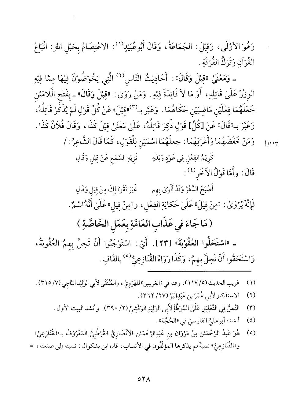 - "استحلوا العقوبة" [23]. أي: استوجبوا أن تحل بهم العقوبة، واستحقوا أن تحل بهم، وكذا رواه القنازعي بالقاف.