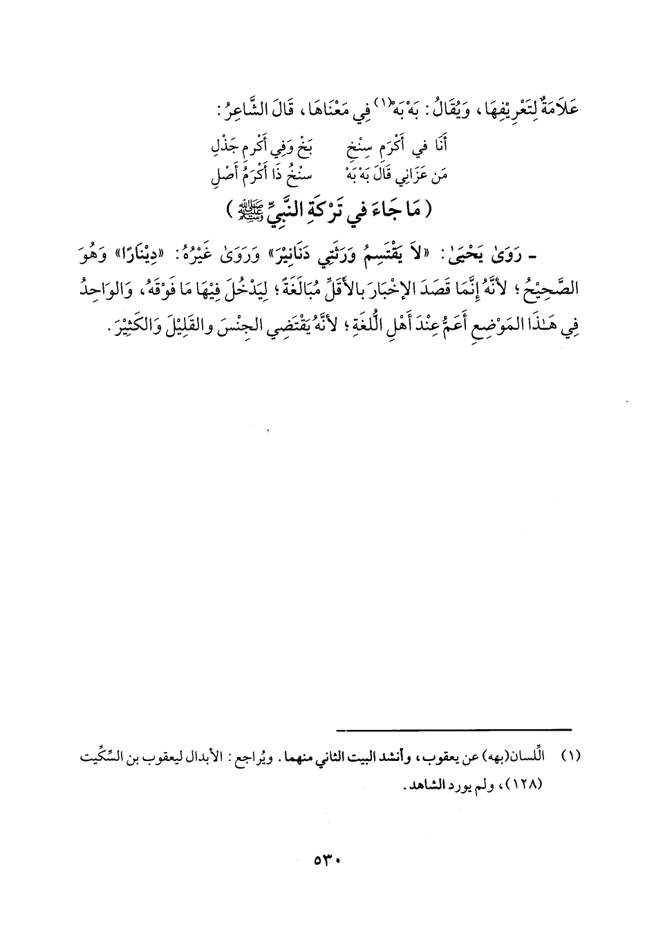 - روى يحيى: "لا يقتسم ورثتي دنانير" وروى غيره: "ديناراً" وهو الصحيح؛ لأنه إنما قصد الإخبار بالأقل مبالغة؛ ليدخل فيها ما فوقه، والواحد في هذا الموضع أعم عند أهل اللغة؛ لأنه يقتضي الجنس والقليل والكثير.